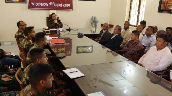 মোঃ নাছির উদ্দীন দীঘিনালা খাগড়াছড়ি । খাগড়াছড়ি দীঘিনালা, ২৩ ফেব্রুয়ারি — আজ সকাল ১১:০০ ঘটিকায় দীঘিনালা জোন-এ জোন কমান্ডার লে. কর্নেল আল-আমিন, এসইউপি, পিএসসি মহোদয়ের উপস্থিতিতে এক আলোচনা ও মতবিনিময় সভা অনুষ্ঠিত হয়েছে। সভায় উপস্থিত ছিলেন জোনাল স্টাফ অফিসার মেজর তৌকির আহমেদ, এসইউপি, পিএসসি; ক্যাম্প কমান্ডার ক্যাপ্টেন হাসনাইন আলভী; আরএমও ক্যাপ্টেন মো. শায়খউদ্দীন সাকলাইন; কিউএম