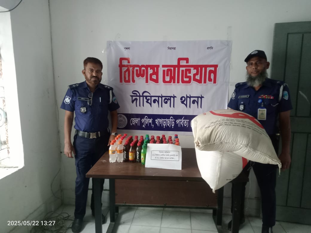 খাগড়াছড়ির দীঘিনালা উপজেলায় ৭০ কেজি চালসহ ১৬ লিটার দেশীয় চোলাই মদ জ্বদ করেছে থানা পুলিশ।