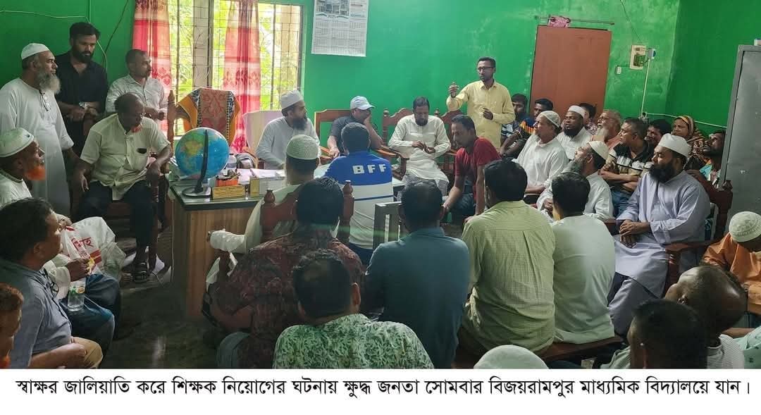 সাবেক ধর্ম প্রতিমন্ত্রী মরহুম মুফতি মুহাম্মদ ওয়াক্কাস সহ একাধীক ব্যক্তির স্বাক্ষর জাল করে বদরিজ্জামান সহকারী শিক্ষক পদে নিয়োগের ঘটনার চাঞ্চল্যকর তথ্য বেরিয়ে এসেছে। অবশ্য, ইতি মধ্যে নিয়োগপ্রাপ্ত সেই শিক্ষককের এমপিও স্থগিত করা হয়েছে। জালিয়াতির নেপথ্যে থাকা বিজয়রামপুর মাধ্যমিক বিদ্যালয়ের প্রধান শিক্ষক তাপস কুমার পাইনের বিরুদ্ধে বিধি সম্মতভাবে ব্যবস্থা নিতে সচ্চোর হয়েছে ক্ষুদ্ধ এলাকাবাসী। সোমবার (২৩জুন) সকালে জালিয়াতির বিষয়ে কৈফিয়ত নিতে বিজয়রামপুর মাধ্যমিক বিদ্যালয়ে আসেন ক্ষুদ্ধ এলাকাবাসী। যদিও প্রধান শিক্ষক তাপস কুমার পাইন সভাপতির অনুমতি ছুটি ছাড়াই অনুপস্থিত ছিলেন বিদ্যালয়ে। যে কারণে ক্ষুদ্ধ জনতার রোশানলে পড়েন বিদ্যালয়ের ম্যানেজিং কমিটির বর্তমান সভাপতি জাহিদুল ইসলাম।