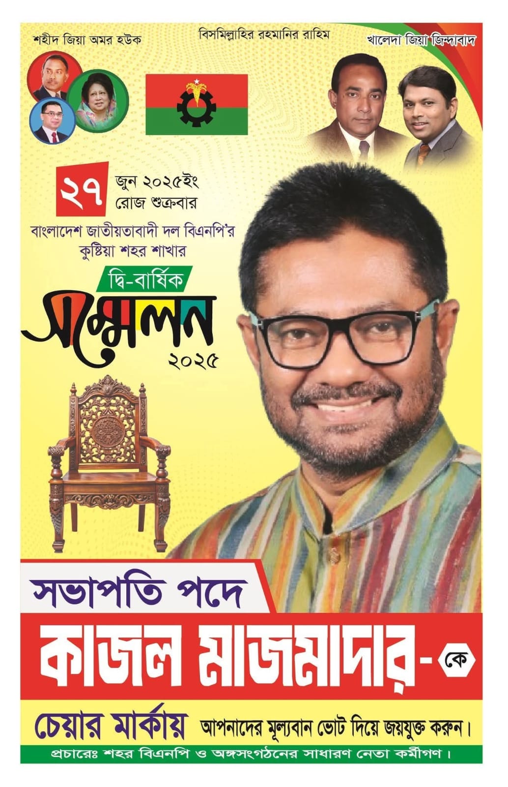 নির্বাচন কমিশনের সিদ্ধান্ত মোতাবেক কুষ্টিয়া পৌর বিএনপির দ্বি-বার্ষিক সম্মেলন-২০২৫ আগামীকাল অনুষ্ঠিত হতে যাচ্ছে। সম্মেলনের অংশ হিসেবে ভোটগ্রহণ পর্বটি আগামীকাল শুক্রবার (২৭ জুন) সকাল ১০ ঘটিকায় কুষ্টিয়া সরকারি কলেজ প্রাঙ্গণে অনুষ্ঠিত হবে। সম্মেলনকে ঘিরে ইতোমধ্যেই নেতাকর্মীদের মধ্যে প্রাণচাঞ্চল্য দেখা দিয়েছে। বিভিন্ন পদে প্রতিদ্বন্দ্বী প্রার্থীরা শেষ মুহূর্তে সমর্থকদের নিয়ে প্রচারে ব্যস্ত সময় পার করছেন। দ্বি-বার্ষিক এই সম্মেলনের মাধ্যমে কুষ্টিয়া পৌর বিএনপির নতুন নেতৃত্ব নির্বাচন করা হবে। নির্বাচন পরিচালনার জন্য নিরপেক্ষ নির্বাচন কমিশন গঠন করা হয়েছে এবং শান্তিপূর্ণ ও সুষ্ঠু ভোট নিশ্চিত করতে প্রয়োজনীয় নিরাপত্তাব্যবস্থা গ্রহণ করা হয়েছে বলে দলীয় সূত্রে জানা গেছে। বিএনপির কেন্দ্রীয় নেতারাও এ সম্মেলনের প্রতি দৃষ্টি রাখছেন বলে জানা গেছে। আশা করা হচ্ছে, এ সম্মেলনের মধ্য দিয়ে কুষ্টিয়া পৌর বিএনপির সাংগঠনিক কার্যক্রম আরও বেগবান হবে এবং দলীয় ঐক্য আরও সুসংহত হবে।