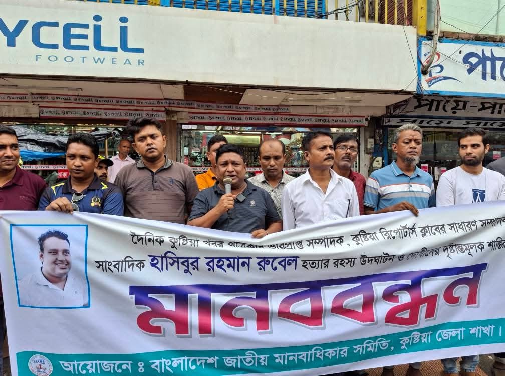 কুষ্টিয়ায় সাংবাদিক হাসিবুর রহমান রুবেল হতার ৩ বছর পেরিয়ে গেলেও এখন পর্যন্ত হত্যায় জড়িতদের গ্রেফতার করতে পারিনি আইনশৃঙ্খলা বাহিনী। খুনিদের গ্রেপ্তার ও বিচারের দাবিতে কুষ্টিয়ায় বাংলাদেশ মানবাধিকার সমিতি কুষ্টিয়া জেলা শাখার উদ্যোগে শহরের থানা মোড়ে সোমবার (৭ জুলাই ২০২৫) বিকেলে মানববন্ধন করেছেন কুষ্টিয়ার সর্বস্তরের সাংবাদিকরা।