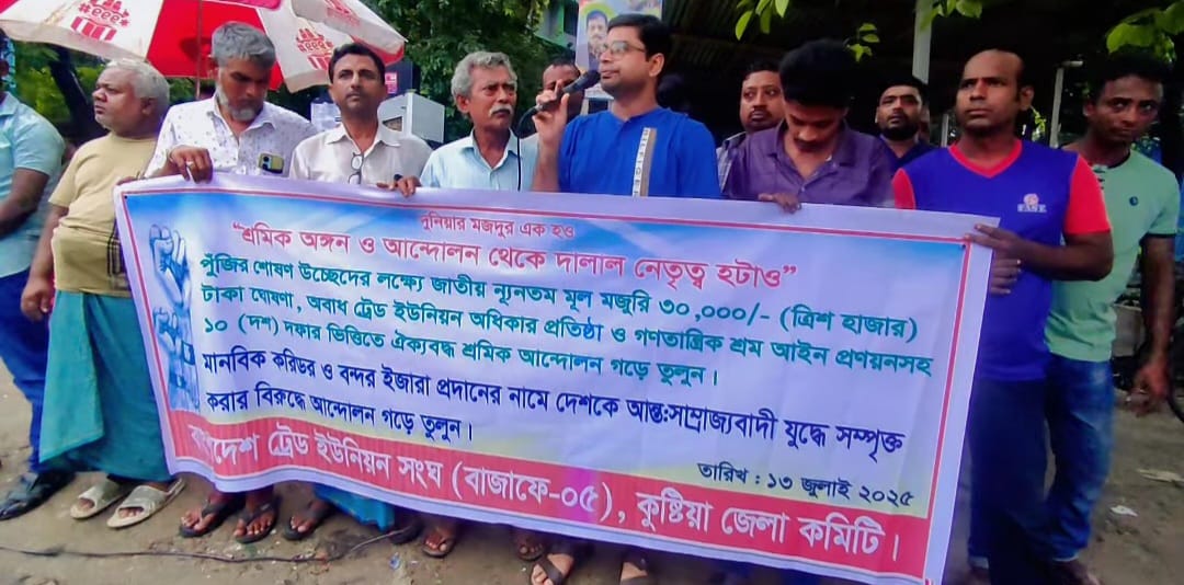পুঁজিবাদী শোষণের অবসান ও শ্রমিক অধিকার প্রতিষ্ঠার লক্ষ্যে ‘দালাল নেতৃত্ব হটাও’ শ্লোগানে রবিবার (১৩ জুলাই ২০২৫) কুষ্টিয়ায় এক প্রতিবাদী সমাবেশ অনুষ্ঠিত হয়। প্রধাণ অতিথি হিসেবে উপস্থিত ছিলেন কেন্দ্রীয় কমিটির যুগ্ম সাধারণ সম্পাদক শ্রমিক নেতা প্রকাশ দত্ত বিশেষ অতিথি ছিলেন কেন্দ্রীয় কমিটির যুগ্ম সাধারণ সম্পাদক তোফাজ্জল হোসেন। কুষ্টিয়া জেলার ভারপ্রাপ্ত সভাপতি রমজান আলী বিশ্বাসের সভাপতিত্বে অনুষ্ঠিত সভায় সাংগঠনিক রিপোর্ট পেশ করেন জেলা কমিটির সাধারণ সম্পাদক পলান বিশ্বাস। আসাদুজ্জামান আসাদ, গীতিকার আজব আলী,তোরাব আলী,আমানত শেখ, লিয়াকত মৃধা,এস এম বিল্লাল, ওয়াহিদুজ্জামান অর্ক,পারভেজ হোসেন, প্রমূখ। বাংলাদেশ ট্রেড ইউনিয়ন সংঘ (বাজাফে-০৫) কুষ্টিয়া জেলা কমিটির উদ্যোগে আয়োজিত এই কর্মসূচিতে শ্রমিকদের জন্য জাতীয় ন্যূনতম মজুরি ৩০,০০০ টাকা ঘোষণা, অবাধ ট্রেড ইউনিয়ন অধিকার, গণতান্ত্রিক শ্রম আইন প্রণয়নসহ ১০ দফা দাবি উপস্থাপন করা হয়। বক্তারা বলেন, “বর্তমানে শ্রমিক সংগঠনগুলো দালাল ও পুঁজিপন্থী নেতৃত্ব দ্বারা নিয়ন্ত্রিত হচ্ছে। এ অবস্থার পরিবর্তন করে প্রকৃত শ্রমিক নেতৃত্ব প্রতিষ্ঠা করতে হবে।” সমাবেশে আরও দাবি তোলা হয়, মানবিক করিডর ও বন্দর ইজারার নামে দেশকে আন্তর্জাতিক সাম্রাজ্যবাদী ষড়যন্ত্রে জড়ানো হচ্ছে—এটা বন্ধ করতে হবে। বক্তারা বলেন, “বন্দর, রেলপথ ও করিডর ব্যবস্থাপনার মাধ্যমে দেশের সার্বভৌমত্ব বিপন্ন হওয়ার ঝুঁকি তৈরি হচ্ছে। জনগণের মতামতকে উপেক্ষা করে আন্তর্জাতিক চাপে সরকার এই পথে হাঁটছে।” বক্তারা শ্রমিকদের ঐক্যবদ্ধ হওয়ার আহ্বান জানিয়ে বলেন, “দাবি আদায় করতে হলে আন্দোলনের বিকল্প নেই। লড়াইয়ের মধ্য দিয়েই শ্রমিক শ্রেণির অধিকার নিশ্চিত করতে হবে।” এই সমাবেশে জেলার বিভিন্ন শিল্প-কারখানার শ্রমিকরা অংশ নেন এবং কর্মসূচি শেষে পরবর্তী আন্দোলনের রূপরেখা নির্ধারণে এক সিদ্ধান্ত গৃহীত হয়। বক্তারা আরো বলেন আজ পর্যন্ত কোনো দিন ও শ্রমিকদের মজুরীর একটি টাকা বাড়েনি।বরং কমানোর চেষ্টায় থাকে যাহাতে শ্রমিক অর্ধমৃত বেঁচে থেকে শ্রম বেচতে পারে আর সে মরে গেলে তার স্হানে আরেক জন বা তার সন্তান শ্রম বেচতে পারে।