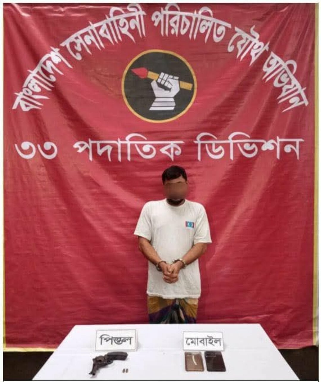 ঢাকা, ১৬ জুলাই ২০২৫ (বুধবার): গত রাত আনুমানিক ৩ টায় ব্রাহ্মণবাড়িয়া জেলার আশুগঞ্জ উপজেলার চরচরটোলা এলাকায় সুনির্দিষ্ট গোয়েন্দা তথ্যের ভিত্তিতে সেনাবাহিনীর নেতৃত্বে একটি যৌথ অভিযান পরিচালনা করে অবৈধ অস্ত্রধারী আসাদ মিয়া’কে গ্রেফতার করা হয়। অভিযানে ১টি মার্কিন রিভলবার, ২ রাউন্ড এ্যামোনিশন এবং ২টি মোবাইল ফোন উদ্ধার করা হয়।