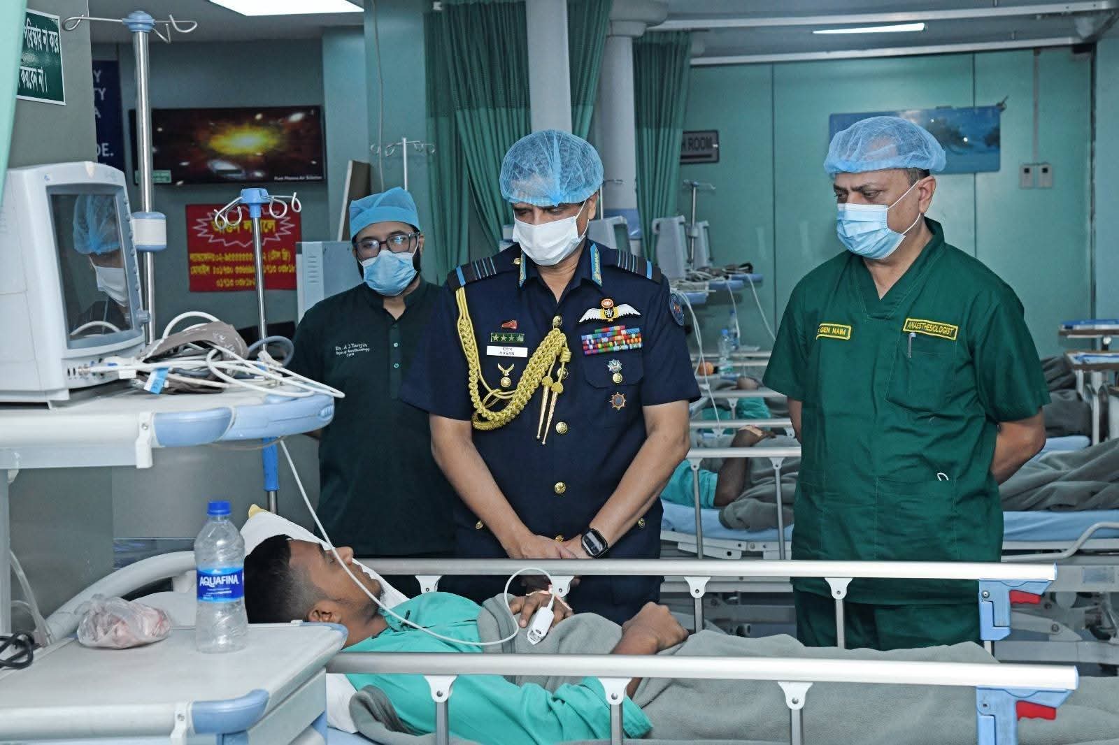 উত্তরায় সম্প্রতি সংঘটিত মর্মান্তিক বিমান দুর্ঘটনায় আহতদের শারীরিক অবস্থা ও চিকিৎসা কার্যক্রম সরেজমিনে পর্যালোচনার উদ্দেশ্যে আজ বার্ন অ্যান্ড প্লাস্টিক সার্জারি ইনস্টিটিউট এবং সম্মিলিত সামরিক হাসপাতাল (সিএমএইচ), ঢাকা পরিদর্শন করেন বাংলাদেশ বিমান বাহিনীর সম্মানিত প্রধান।