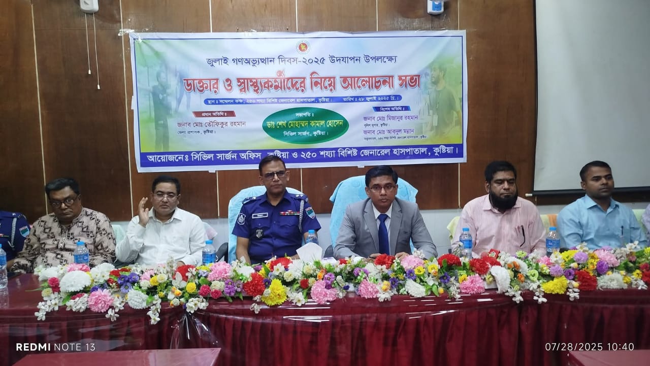 আলোচনা সভায় আরও উপস্থিত ছিলেন হাসপাতালের আরএমও ডাঃ হোসেন ঈমাম,কুষ্টিয়া জেলা জামায়াতে ইসলামীর নায়েবে আমীর আব্দুল গফুর,সহকারী সেক্রেটারি খায়রুল ইসলাম রবিন, সিভিল সার্জন অফিস ও হাসপাতালের কর্মকর্তা-কর্মচারীসহ স্থানীয় রাজনৈতিক নেতারা।