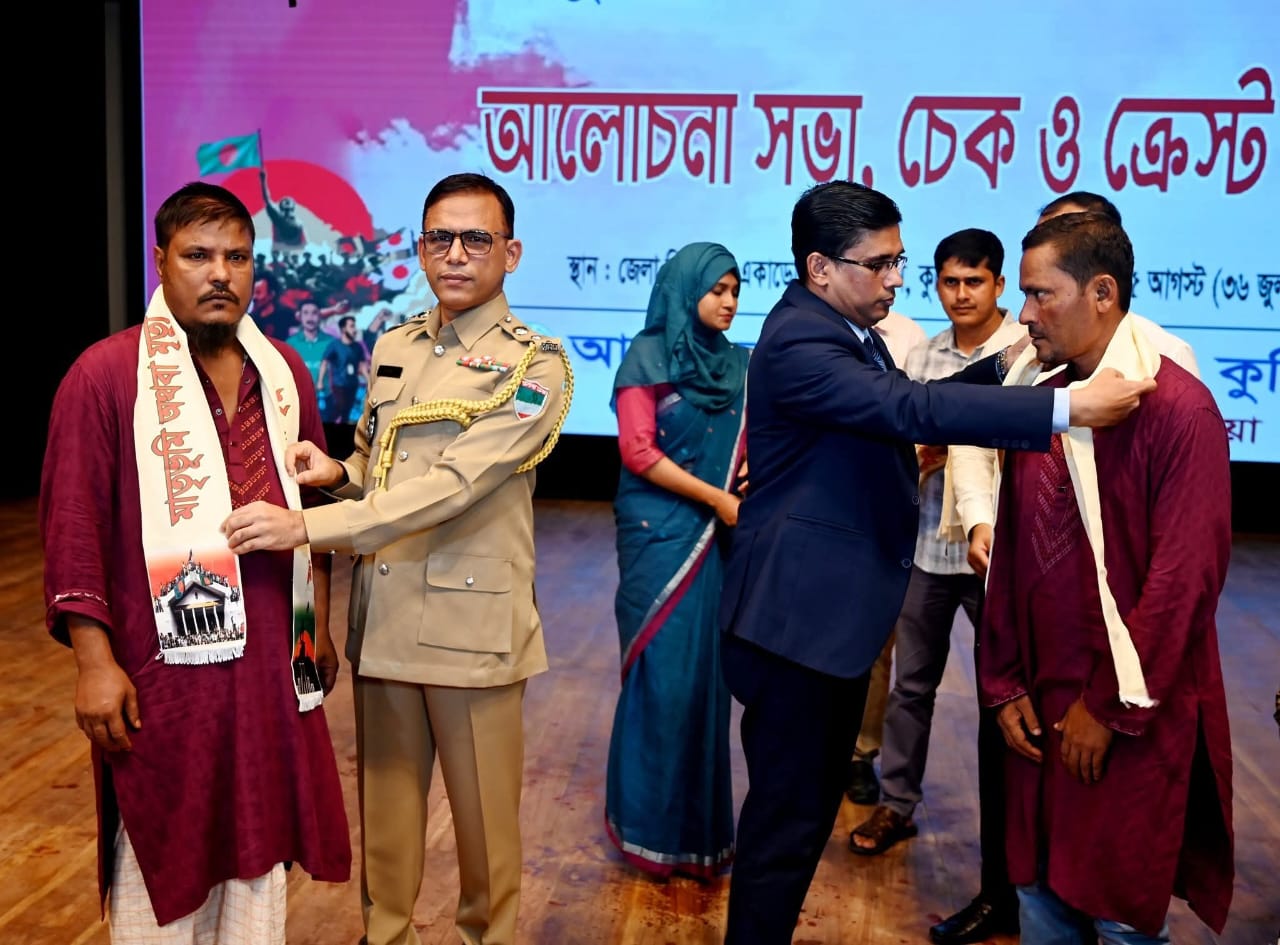 অনুষ্ঠানের শুরুতে জাতির শ্রেষ্ঠ সন্তানদের স্মরণে এক মিনিট নীরবতা পালন ও তাঁদের আত্মার মাগফিরাত কামনায় দোয়া অনুষ্ঠিত হয়। এরপর আন্দোলনে শহীদ হওয়া পরিবার ও অংশগ্রহণকারী যোদ্ধাদের হাতে সম্মাননা স্মারক, চেক এবং ক্রেস্ট তুলে দেওয়া হয়। পুলিশ সুপার এবং জেলা প্রশাসক সম্মাননার এই মুহূর্তে শহীদ পরিবারের সদস্যদের পাশে থেকে তাঁদের প্রতি কৃতজ্ঞতা ও শ্রদ্ধা জ্ঞাপন করেন।