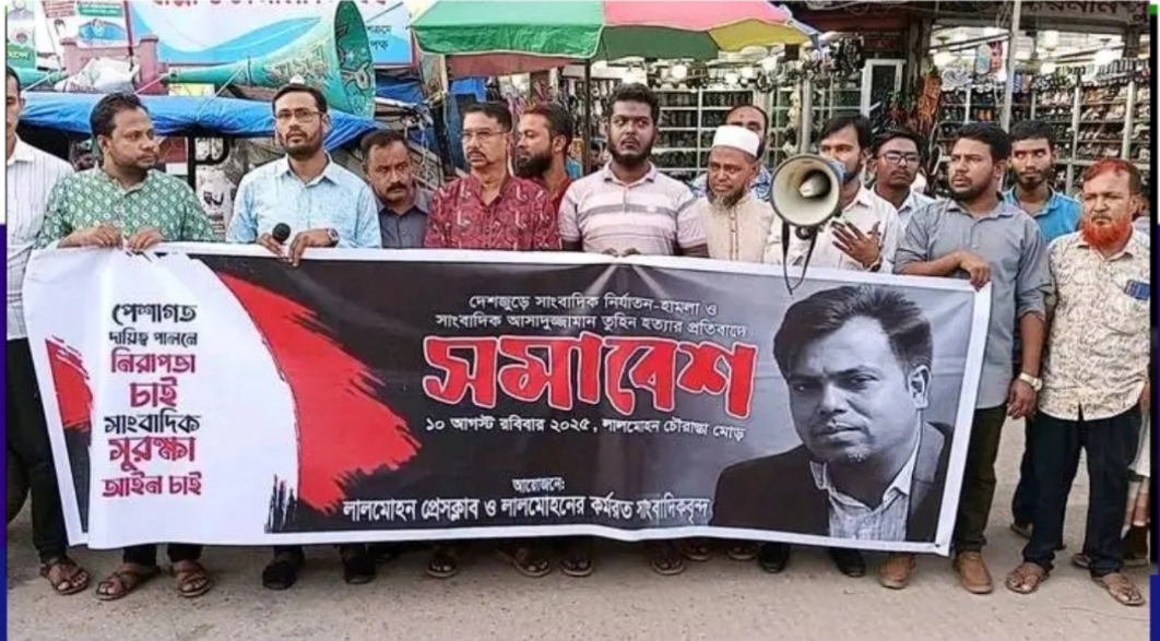 গাজীপুরের সাংবাদিক আসাদুজ্জামান তুহিনকে প্রকাশ্যে কুপিয়ে হত্যার প্রতিবাদে ভোলার লালমোহন উপজেলায় প্রতিবাদ সমাবেশ অনুষ্ঠিত হয়েছে। রোববার বিকেলে লালমোহন প্রেস ক্লাব ও লালমোহনে কর্মরত সকল সাংবাদিকদের উদ্যোগে পৌরশহরের চৌরাস্তার মোড়ে এ সমাবেশ হয়।