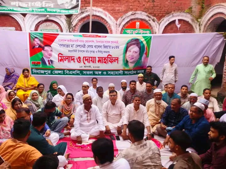 বাংলাদেশ জাতীয়তাবাদী দল (বিএনপি) চেয়ারপারসন ও তিনবারের সাবেক প্রধানমন্ত্রী বেগম খালেদা জিয়ার ৮০তম জন্মবার্ষিকী উপলক্ষে তাঁর সুস্বাস্থ্য ও দীর্ঘায়ু কামনায় দিনাজপুর জেলা বিএনপির উদ্যোগে মিলাদ ও দোয়া মাহফিল অনুষ্ঠিত হয়েছে।