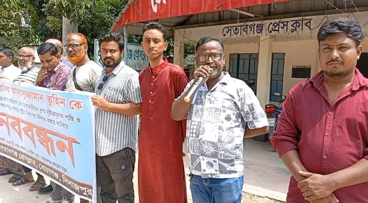 মানববন্ধনে বক্তব্য রাখেন সেতাবগঞ্জ প্রেসক্লাবের আহ্বায়ক আব্দুস সাত্তার, সদস্য সচিব মোঃ শামসুল আলম, মোঃ সাজ্জাদ হোসেন, ফরিদ আহমেদ প্রমুখ। এসময় সেতাবগঞ্জ প্রেসক্লাবের সাংবাদিক মোঃ রফিকুল ইসলাম, বরুন চন্দ্র সরকার, মোশারফ হোসেন, মোঃ আশিকুর ইসলাম, লিখন বনিক শুভ, রাসেল ইসলাম, আবুল ওহাব, লতিফুল ইসলাম ফুল, সাজ্জাদ হোসান, মিজানুর রহমান, মোঃ তনি,মোঃ তারিকুল ইসলাম তপু, দৈনিক নিরপেক্ষ পত্রিকার উপজেলা প্রতিনিধি মোঃ আসাদ আলী, সহ আজহারুল ইসলাম (রাজা), প্রমুখ উপস্থিত ছিলেন।