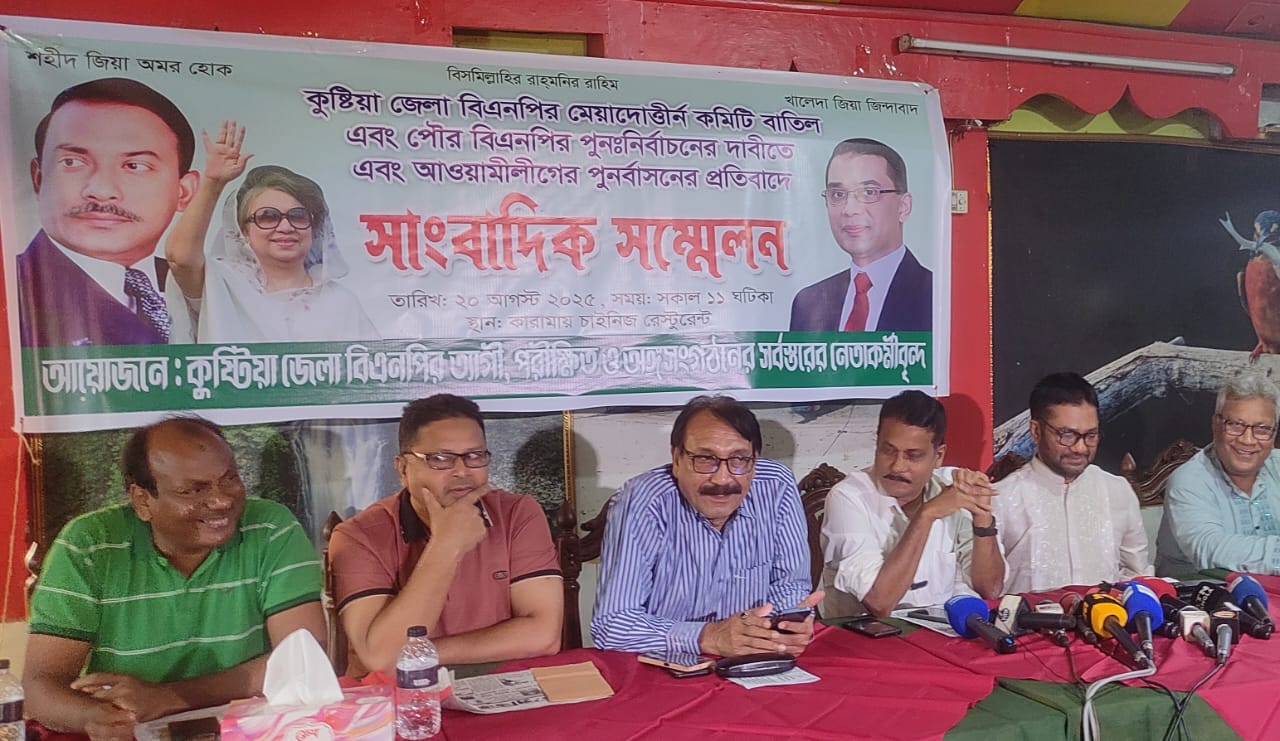 কুষ্টিয়া জেলা বিএনপির বর্তমান আহ্বায়ক কমিটি বিতর্কিত ও মেয়াদোত্তীর্ণ উল্লেখ করে কমিটি বাতিলের দাবিতে সংবাদ সম্মেলন করেছেন জেলা বিএনপির পদবঞ্চিত নেতারা। বুধবার (২০ আগস্ট) দুপুরে ১২ টার সময় শহরের এনএস রোডসংলগ্ন একটি রেস্টুরেন্টে এ সংবাদ সম্মেলন অনুষ্ঠিত হয়। সংবাদ সম্মেলনে উপস্থিত ছিলেন কুষ্টিয়া সদর উপজেলা বিএনপির সাবেক সহ-সভাপতি বশিরুল আলম চাঁদ, জেলা বিএনপির সাবেক যুগ্ম-সাধারণ সম্পাদক কাজল মাজমাদার, সাবেক সাংগঠনিক সম্পাদক অ্যাডভোকেট শামীমুল হাসান অপু। আরো উপস্থিত ছিলেন মিরাজুল ইসলাম রিন্টু,সাবেক যুব বিষয়ক সম্পাদক মেজবাউর রহমান পিন্টু, জেলা কৃষকদলের সাবেক সভাপতি এস এম গোলাম কবির, জেলা জাসাসের সভাপতি ইমরান আহমেদ সুমন, সদর থানা যুবদলের সাধারণ সম্পাদক ওহিদুজ্জামান শিপনসহ মহিলা দল ও অঙ্গ-সহযোগী সংগঠনের বিপুল সংখ্যক ত্যাগী নেতাকর্মী। লিখিত বক্তব্যে কুষ্টিয়া সদর উপজেলা বিএনপির সাবেক সহ-সভাপতি বশিরুল আলম চাঁদ অভিযোগ করেন, "কুষ্টিয়া জেলার বর্তমান আহ্বায়ক কমিটির মেয়াদ শেষ হলেও এখনো তারা দায়িত্বে রয়েছে। আহ্বায়ক কুতুবউদ্দিন আহমেদ ও সদস্য সচিব ইঞ্জিনিয়ার জাকির হোসেন সরকার বিএনপিকে ধ্বংসের নীলনকশা বাস্তবায়ন করছেন। ত্যাগী ও পরীক্ষিত নেতাদের বাদ দিয়ে স্বজনপ্রীতির আশ্রয়ে নিষ্ক্রিয় ও আপসকামীদের দিয়ে থানা ও ওয়ার্ড কমিটি গঠন করা হচ্ছে। এমনকি কোথাও ভোট বা নির্বাচন ছাড়াই কমিটি ঘোষণা করা হয়েছে। তিনি আরও বলেন, কুষ্টিয়া শহর বিএনপির সম্মেলনে কারচুপি, সরকারী কলেজ মাঠ থেকে পরিত্যক্ত ব্যালট উদ্ধার, বিভিন্ন থানা-ইউনিয়নে গঠনতন্ত্র বিরোধী কমিটি প্রমাণ করে যে বর্তমান আহ্বায়ক কমিটি ব্যর্থ। "এমনকি কুমারখালীর একটি ওয়ার্ড কমিটিতে সহ-সভাপতি করা হয়েছে একজন মৃত ব্যক্তিকে, আবার জাসদের সাধারণ সম্পাদককে বিএনপির ইউনিয়ন সভাপতি করা হয়েছে," দাবি করেন তিনি। সংবাদ সম্মেলনে অন্যান্য পদবঞ্চিত নেতারাও অভিযোগ করেন, এই কমিটির কারণে দলের ভেতরে বিভক্তি সৃষ্টি হয়েছে এবং পরবর্তী জাতীয় নির্বাচনে নেতিবাচক প্রভাব পড়তে পারে। তাই অবিলম্বে বর্তমান আহ্বায়ক কমিটি বাতিল করে ত্যাগী ও যোগ্য নেতাদের নিয়ে নতুন কমিটি গঠনের দাবি জানান তারা। জেলা বিএনপির সাবেক যুগ্ম-সাধারণ সম্পাদক কাজল মাজমাদার মেয়াদোত্তীর্ণ আহ্বায়ক কমিটি প্রসঙ্গে বলেন, বর্তমান জেলা বিএনপির আহ্বায়ক কমিটির মেয়াদ অনেক আগেই শেষ হয়ে গেছে। এই কমিটি দীর্ঘদিন ধরে দলীয় কার্যক্রমকে জিম্মি করে রেখেছে। দলের ত্যাগী ও পরীক্ষিত নেতাকর্মীদের বাদ দিয়ে ইচ্ছেমতো সিদ্ধান্ত গ্রহণ করছে। এতে করে জেলা বিএনপির সাংগঠনিক কার্যক্রম ভীষণভাবে ব্যাহত হচ্ছে। দ্রুত মেয়াদোত্তীর্ণ কমিটি বাতিল