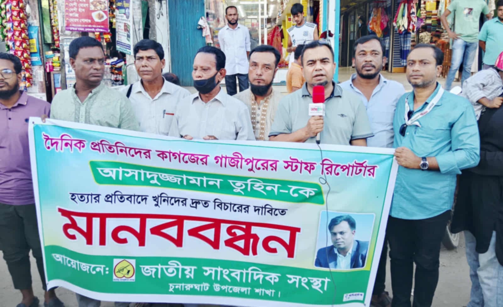 গাজীপুরের দৈনিক আজকের কাগজ পত্রিকার স্টাফ রিপোর্টার আসাদুজ্জামান তুহিনকে প্রকাশ্যে জবাই করে হত্যার প্রতিবাদে এবং সাংবাদিকদের নিরাপত্তার দাবিতে এ কর্মসূচি পালিত হয়।