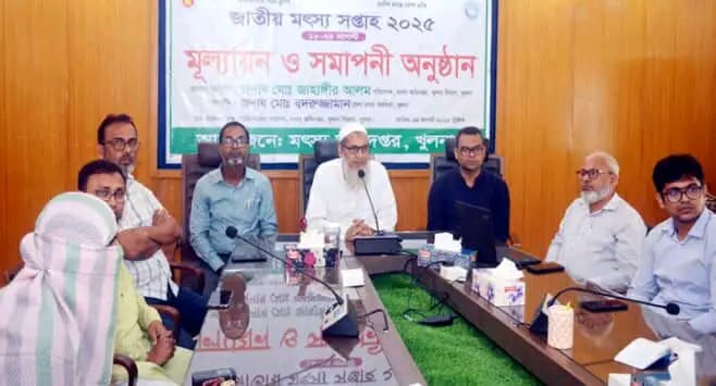মুল্যালয় ও সমাপনী অনুষ্ঠান আজ ২৪ আগষ্ট সকালে মৎস্য অধিদপ্তরের খুলনা বিভাগীয় কার্যালয়ের সন্মেলন কক্ষে অনুষ্ঠিত হয়। সমাপনী অনুষ্ঠানে প্রধান অতিথি ছিলেন মৎস্য অধিদপ্তরের বিভাগীয় কার্যালয়ের পরিচালক মো: জাহাঙ্গীর আলম। অনুষ্ঠানে অতিথিরা বলেন, দেশিয় প্রজাতির মাছ আমাদের ঐতিহ্য ও সংস্কৃতির অংশ। তাই এই প্রজাতির মাছের সংরক্ষণ, উৎপাদন বৃদ্ধি ও নিরাপত্তা নিশ্চিত করতে হবে। নদী- নালা - খালবিল ও প্রাকৃতিক জলাশয়ে দেশিয় মাছ রক্ষা ও সংরক্ষণ অত্যান্ত জরুরি। তারা আরো বলেন, দক্ষিনাঞ্চল মাছ চাষের উর্বর এলাকা। এ অঞ্চল থেকে প্রতিবছর ৭০ থেকে ৮০ শতাংশ চিংড়ি রপ্তানি হয়। যা দেশের অর্থনৈতিক ক্ষেত্রে বিশেষ ভুমিকা রাখে। দেশিয় মাছের উৎপাদন বৃদ্ধিতে অভয়াশ্রমগুলোর কার্যক্রম গতিশীল করতে হবে। সরকার মৎস্যখাতকে এগিয়ে নিতে বিভিন্ন পদক্ষেপ গ্রহন করেছে। মৎস্য সপ্তাহের মাধ্যমে সাধারণ জনগনকে সচেতন করতে পারলে এই খাত আরো গতিশীল হনে বলে আশা করন অতিথিরা। খুলনা জেলা মৎস্য কর্মকর্তা মোঃ বদরুজ্জামানের সভাপতিত্বে অনুষ্ঠানে মৎস্য অধিদপ্তরের বিভাগীয় কার্যালয়ের উপ পরিচালক বিপুল কুমার বসাক, মৎস্য অধিদপ্তরের কোয়ালিটি কন্টোল ল্যাবরেটরির কোয়ালিটি অ্যাসুরেন্স ম্যানেজার মোঃ জাহিদুল হাসান, মৎস্য খামারি শেখ রেজানুল ইসলাম প্রমুখ বক্তব্য রাখেন। সাতদিন ব্যাপী অনুষ্ঠানে মুল্যায়ন বিষয়ে প্রবন্ধ উপস্থাপন করেন জেলা মৎস্য কর্মকর্তার কার্যালয়ের সিনিয়র সহকারী পরিচালক এ টি এম তৌফিক মাহমুদ। খুলনা মৎস্য অধিদপ্তরের জেলা কার্যালয় আয়োজিত সমাপনীতে কর্মকর্তা, মাছচাষী ও মাছ ব্যবসায়ী উপস্থিত ছিলেন।