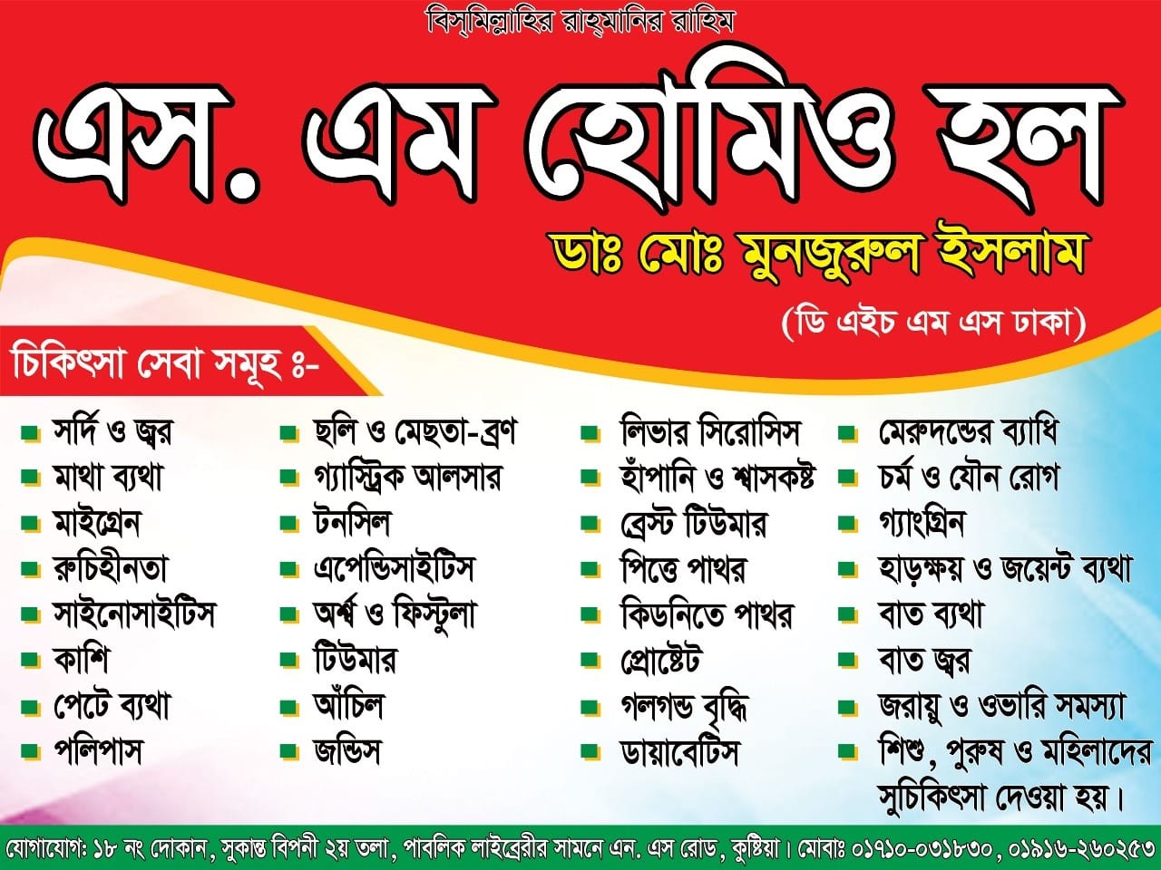 কুষ্টিয়ার হোমিও চিকিৎসা খাতে অবদান রেখে চলেছেন ডাঃ মোঃ মুনজুরুল ইসলাম (ডি এইচ এম এস, ঢাকা)। তাঁর পরিচালিত চিকিৎসালয়,এস.এম হোমিও হল” কুষ্টিয়া শহরের ব্যস্ততম এলাকা এন. এস.রোডে,পাবলিক লাইব্রেরির সামনে অবস্থিত সুকান্ত বিপণির ২য় তলার ১৮ নম্বর দোকানে সেবাদান করে যাচ্ছে বহু বছর ধরে।