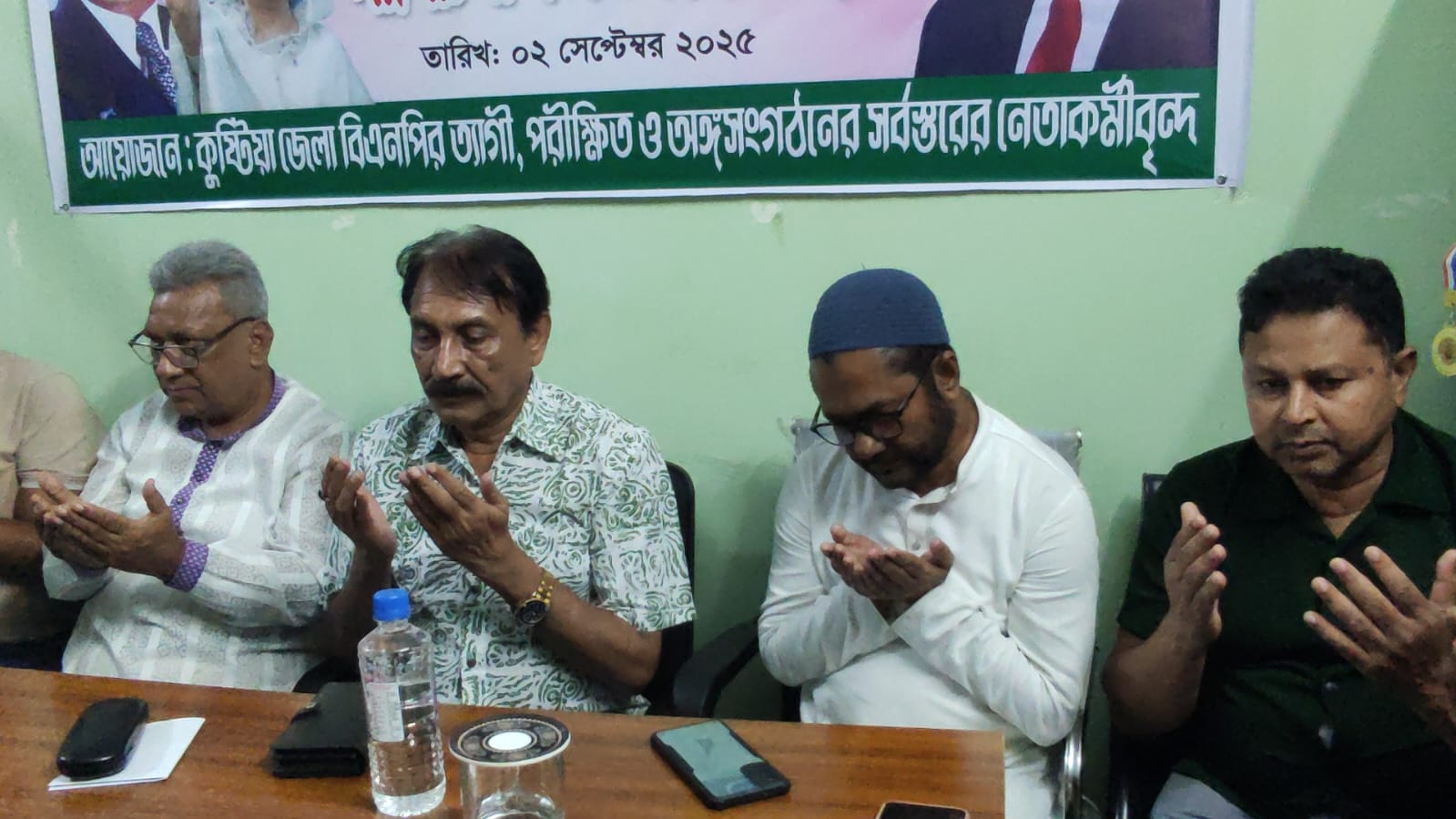 বাংলাদেশ জাতীয়তাবাদী দল (বিএনপি)-এর ৪৭তম প্রতিষ্ঠাবার্ষিকী উপলক্ষে কুষ্টিয়ায় আলোচনা সভা ও দোয়া মাহফিল অনুষ্ঠিত হয়েছে। মঙ্গলবার (২ সেপ্টেম্বর ২০২৫) জেলা বিএনপির ত্যাগী, পরীক্ষিত ও অঙ্গসংগঠনের সর্বস্তরের নেতাকর্মীদের উদ্যোগে শহরের থানাপাড়া এলাকায় পদবঞ্চিত নেতাকর্মীদের নিজস্ব কার্যালয়ে এ আয়োজন করা হয়। অনুষ্ঠানে উপস্থিত ছিলেন কুষ্টিয়া সদর উপজেলা বিএনপির সাবেক সহ-সভাপতি বশিরুল আলম চাঁদ, জেলা বিএনপির সাবেক যুগ্ম-সাধারণ সম্পাদক কাজল মাজমাদার, সাবেক সাংগঠনিক সম্পাদক অ্যাডভোকেট শামীমুল হাসান অপু, মিরাজুল ইসলাম রিন্টু, সাবেক যুব বিষয়ক সম্পাদক মেজবাউর রহমান পিন্টু, জেলা কৃষকদলের সাবেক সভাপতি এস এম গোলাম কবির, সাবেক ক্ষুদ্র ও কুটির শিল্প বিষয়ক সম্পাদক মো. জালাল উদ্দিন, জেলা জাসাসের সভাপতি ইমরান আহমেদ সুমন, মো. রফিকুল ইসলাম এবং সদর থানা যুবদলের সাধারণ সম্পাদক ওহিদুজ্জামান শিপন। এছাড়া জেলা বিএনপি, যুবদল, স্বেচ্ছাসেবক দল, ছাত্রদলসহ অঙ্গ ও সহযোগী সংগঠনের শতাধিক নেতাকর্মী অংশ নেন। আলোচনা সভায় বক্তারা বলেন, বিএনপি দেশের গণতন্ত্র পুনরুদ্ধারের সংগ্রামে সবসময় গুরুত্বপূর্ণ ভূমিকা পালন করে আসছে। শহীদ প্রেসিডেন্ট জিয়াউর রহমানের আদর্শ, বেগম খালেদা জিয়ার ত্যাগ এবং দেশনেতা তারেক রহমানের নেতৃত্বে জনগণের অধিকার ফিরিয়ে আনতে দলের নেতাকর্মীরা ঐক্যবদ্ধভাবে কাজ করে যাচ্ছে। তারা আরও বলেন, বর্তমান জাতীয় সঙ্কট নিরসনে জাতীয়তাবাদী শক্তিকে সংগঠিত করতে হবে এবং এজন্য তৃণমূল পর্যায়ের নেতাকর্মীদের সক্রিয় ভূমিকা রাখা জরুরি। আলোচনা সভা শেষে শহীদ প্রেসিডেন্ট জিয়াউর রহমানসহ বিএনপির সকল শহীদদের রূহের মাগফেরাত কামনা করে বিশেষ দোয়া মাহফিল অনুষ্ঠিত হয়।