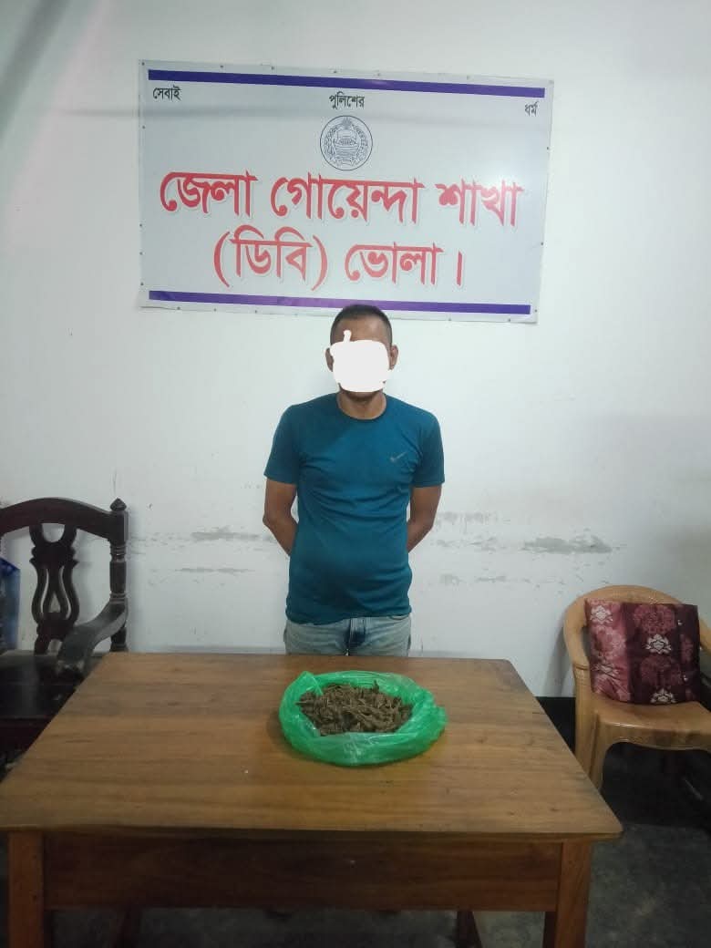 ইং ০২-০৯-২০২৫ তারিখ ২২.১০ ঘটিকায় সময় জেলা গোয়েন্দা শাখা (ডিবি) ভোলার এসআই (নিঃ)/মাহমুদুল হাসান বাপ্পী সংঙ্গীয় ফোর্সসহ মাদক উদ্ধার অভিযান পরিচালনা করিয়া ভোলা সদর থানাধীন বাংলা স্কুল এর ব্রিজের নিচে খালপাড়ে পাকা রাস্তার উপর থেকে আসামী প্রদীপ ঘোষ (৪২), পিতা-মৃত চৈতন্য ঘোষ, মাতা-জোৎস্না ঘোষ, সাং-৭নং ওয়ার্ড, মোনালিসা গলি, ভোলা পৌরসভা, থানা ও জেলা-ভোলার নিকট হইতে ৫০০ গ্রাম গাঁজাসহ আসামীকে গ্রেফতার করা হয়। আসামীর বিরুদ্ধে মামলা রুজু প্রক্রিয়াধীন।