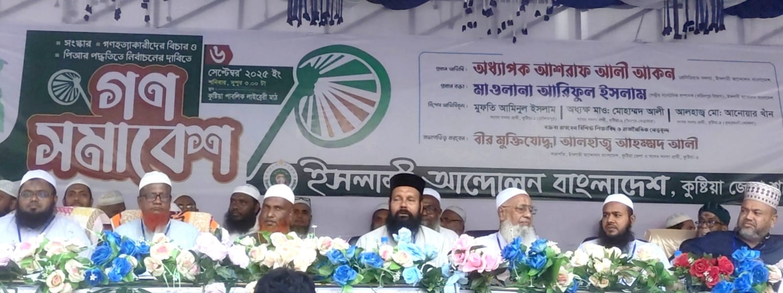 ইসলামী আন্দোলন বাংলাদেশ কুষ্টিয়া জেলা শাখার উদ্যোগে বর্ণাঢ্য আয়োজনে গণসমাবেশ অনুষ্ঠিত হয়েছে। শনিবার (৬ সেপ্টেম্বর ২০২৫) দুপুরে কুষ্টিয়া পাবলিক লাইব্রেরি মাঠে এই সমাবেশের আয়োজন করা হয়। অনুষ্ঠানের শুরুতে পবিত্র কোরআন তেলাওয়াত করেন হাফেজ মাওলানা মোঃ আশরাফুল ইসলাম এবং ইসলামী সংগীত পরিবেশন করেন এইচ এম মোজাম্মেল চৌধুরী। উদ্বোধনী বক্তব্য রাখেন বীর মুক্তিযোদ্ধা আলহাজ্ব আহাম্মাদ আলী,যিনি পরে সমাবেশের সভাপতিত্বও করেন। সমাবেশে প্রধান অতিথি হিসেবে উপস্থিত ছিলেন ইসলামী আন্দোলন বাংলাদেশের প্রেসিডিয়াম সদস্য অধ্যাপক আশরাফ আলী আকন। প্রধান বক্তা ছিলেন কেন্দ্রীয় সাংগঠনিক সম্পাদক (ফরিদপুর বিভাগ) মাওলানা আরিফুল ইসলাম। বিশেষ অতিথি হিসেবে বক্তব্য রাখেন ইসলামী আন্দোলন বাংলাদেশ কুষ্টিয়া জেলা নির্বাচনী পরিচালনা কমিটির আহ্বায়ক মাওলানা নুর মোহাম্মাদ বিন হানিফ, জেলা শাখার সহসভাপতি ডা. মাওলানা দেওয়ান আব্দুল খালেক,আলহাজ্ব শেখ এনামুল হক ও জনাব আমিনুল ইসলাম মুলতানসহ বিভিন্ন স্তরের নেতৃবৃন্দ। এছাড়াও গণসমাবেশে বক্তব্য রাখেন সংসদ সদস্য প্রার্থী অধ্যক্ষ মাওলানা মোহাম্মদ আলী (কুষ্টিয়া-২)। সংসদ সদস্য প্রার্থী মুফতি আমিনুল ইসলাম (কুষ্টিয়া-১)। সংসদ সদস্য প্রার্থী আলহাজ্ব আনোয়ার খান (কুষ্টিয়া-৪)। জেলা সেক্রেটারি জি এম তাওহিদ আনোয়ার। কুষ্টিয়া সদর থানা সভাপতি মুফতি মুখতারুজ্জামান। মিরপুর থানা সভাপতি আলহাজ্ব সিরাজুল ইসলাম। ভেড়ামারা থানা সভাপতি আলহাজ্ব মোঃ ফজলুল হক। ইবি থানা সভাপতি মুফতি কামরুজ্জামান। কুমারখালী থানা সভাপতি ডা. গোলাম সরোয়ার হোসেন। খোকসা সেক্রেটারি ক্বারী আবু সাঈদ। কুষ্টিয়া পৌরসভা সভাপতি এস এম শফিকুল ইসলাম। মুফতি ফরিদ উদ্দিন আবরার (জয়েন্ট সেক্রেটারি)। মুফতি মোজাম্মেল হক কাসেমী (সাংগঠনিক সম্পাদক)। মুফতি আহমাদ উল্লাহ হাব্বী (দফতর সম্পাদক)। মুফতি হাফেজ মাওলানা উসমান গনী (প্রশিক্ষণ সম্পাদক)। আলহাজ্ব তরিকুল ইসলাম মানিক (সহ-প্রচার সম্পাদক)এছাড়াও অঙ্গ ও সহযোগী সংগঠনের জেলা পর্যায়ের সভাপতি-সাধারণ সম্পাদকরা উপস্থিত ছিলেন। বক্তারা বলেন,দেশে গণতান্ত্রিক পরিবেশ ফিরিয়ে আনতে প্রোপোরশনাল রিপ্রেজেন্টেশন (পিআর) পদ্ধতিতে নির্বাচন জরুরি। পাশাপাশি অতীতের সংস্কার গণহত্যাকারীদের বিচার আইনের আওতায় এনে নিশ্চিত করতে হবে। তারা আরও বলেন,জনগণের ভোটাধিকার ও ন্যায়বিচার প্রতিষ্ঠায় ইসলামী আন্দোলন বাংলাদেশ নিরলসভাবে কাজ করছে। সমাবেশে বক্তারা ন্যায়ভিত্তিক সমাজ প্রতিষ্ঠা, ইসলামী মূল্যবোধের প্রচার এবং দুর্নীতি-অন্যায়ের বিরুদ্ধে ঐক্যবদ্ধ আন্দোলনের আহ্বান জানান।