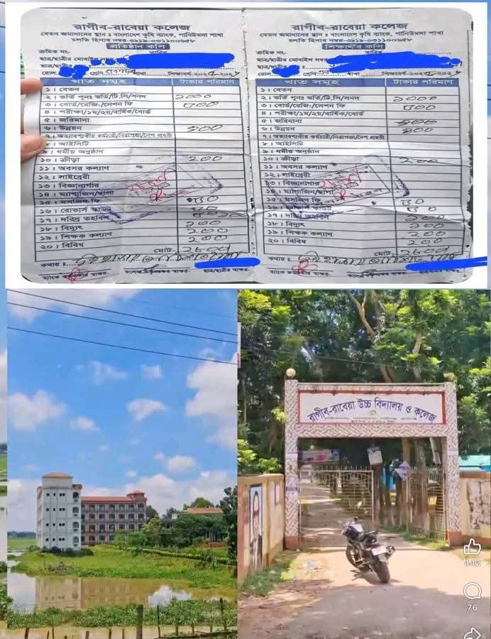 এলাকার সচেতন সমাজ নিরব দর্শকের ভূমিকায়। সরকারি বিধি মোতাবেক মফস্বল কলেজে ভর্তির ফি সর্বোচ্চ ১৫০০ টাকা নেওয়ার বিধান থাকলেও প্রতিষ্ঠানের অধ্যক্ষ এনামুল হক এই কলেজে যোগদানের পর থেকেই প্রতি বছর ভর্তি ফি দিগুণ নিয়ে আসছেন। এবার ২০২৫/২৬ সেশনে ভর্তি ফি নিচ্ছেন ২৮০০ টাকা অথচ নিকটবর্তী দিনারপুর কলেজ নিচ্ছে ২০০০ টাকা। এই বিষয়ে পূর্বে তার বিরুদ্ধে বিভিন্ন স্থানীয় ও জাতীয় পত্রিকায় নিউজ হলেও স্থানীয় আওয়ামীলীগ নেতা কলেজ কমিটির সভাপতি ইজাজুল চেয়ারম্যানের সাথে আতাত করে তার অনিয়ম ও অনৈতিক কাজ পরিচালনা করে যাচ্ছিলেন। এখন বিএনপির নাম ভাঙ্গিয়ে এবং জাতীয় বিশ্ববিদ্যালয়ের ভিসি সাহেব উনার ঘনিষ্ঠ বন্ধু এই পরিচয়ে তার দূর্নীতি ও অনিয়ম পররিচালনা করে যাচ্ছেন। কলেজের পরিচালনা পর্ষদের সভাপতি ও অন্যান্য সদস্য তার অনুগতদের নিয়ে গঠন করেছেন। এই অনিয়ম ও দুর্নীতি কি এভাবেই চলতে থাকবে..?? এলাকায় কি এখনও এই দূর্নীতির বিরুদ্ধে কথা বলার মত লোক নেই..??