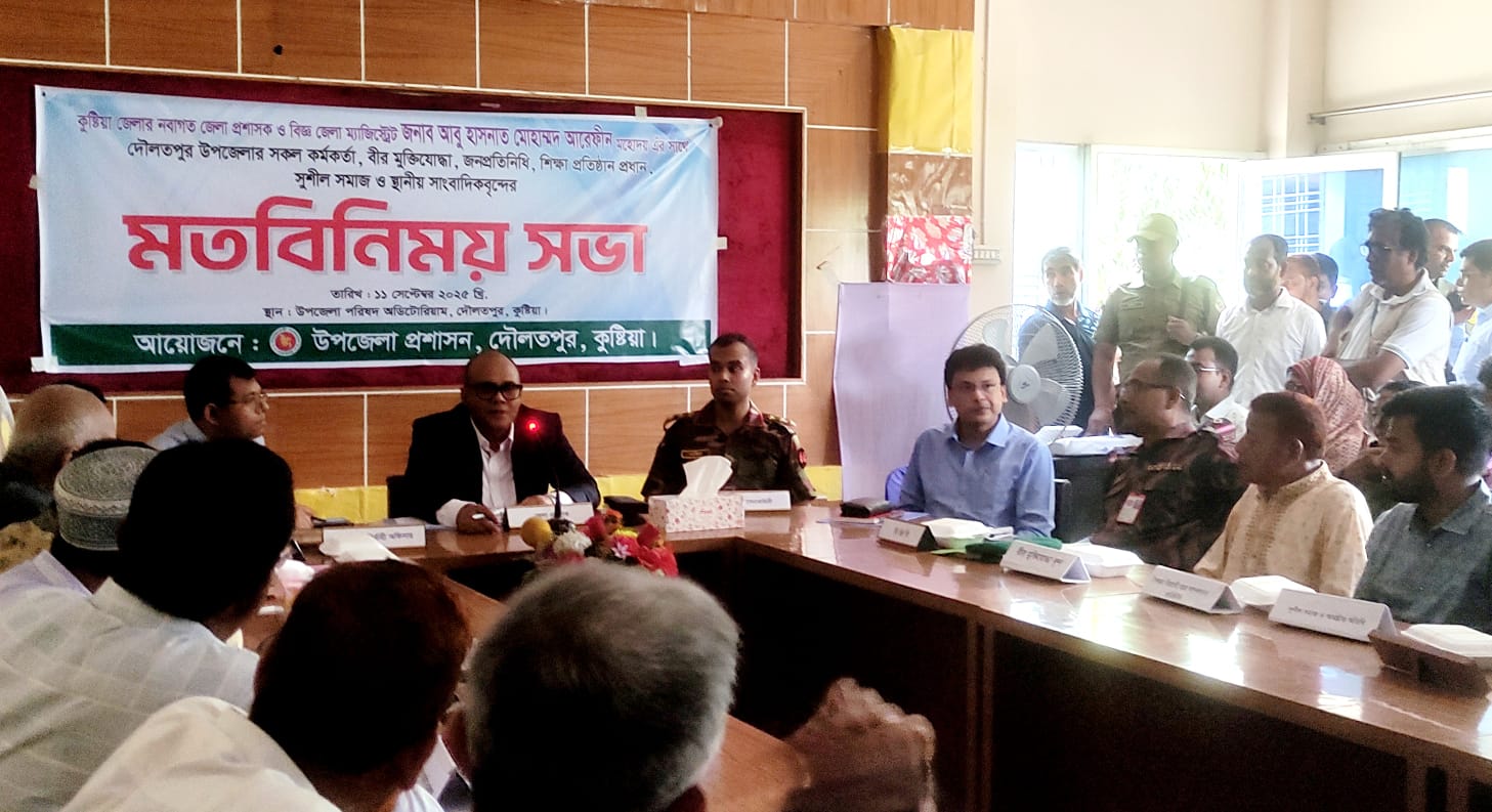 কুষ্টিয়া জেলার নবাগত জেলা প্রশাসক ও বিজ্ঞ জেলা ম্যাজিস্ট্রেট আবু হাসনাত মোহাম্মদ আরেফীন মহোদয়ের সাথে দৌলতপুর উপজেলার বিভিন্ন শ্রেণি-পেশার মানুষের মতবিনিময় সভা অনুষ্ঠিত হয়েছে।বৃহস্পতিবার (১১সেপ্টেম্বর) সকাল ১১টায় দৌলতপুর উপজেলা পরিষদ অডিটোরিয়ামে এ মতবিনিময় সভার আয়োজন করে উপজেলা প্রশাসন।
