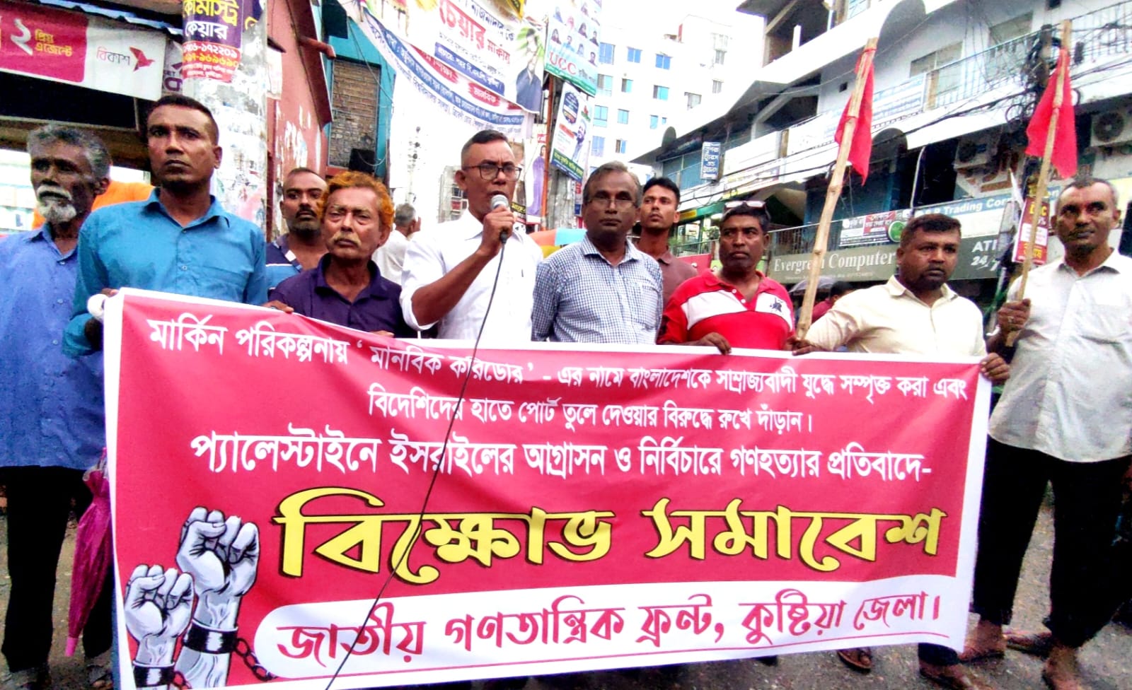 জাতীয় গণতান্ত্রিক ফ্রন্ট (জাগফ) কুষ্টিয়া জেলা শাখার উদ্যোগে বিক্ষোভ মিছিল ও প্রতিবাদ সমাবেশ অনুষ্ঠিত হয়েছে। সোমবার (১৫ সেপ্টেম্বর) বিকেল ৫টায় কুষ্টিয়া বাবর আলী গেটস্থ জেলা কার্যালয় থেকে একটি বিক্ষোভ মিছিল বের হয়ে শহরের প্রধান সড়ক প্রদক্ষিণ করে থানার মোড়ে সমাবেশে মিলিত হয়। জেলা সভাপতি মোকতারুল ইসলামের সভাপতিত্বে সমাবেশ সঞ্চালনা করেন জেলা সাধারণ সম্পাদক আসাদুল হক। এতে বক্তব্য রাখেন সংগঠনের কেন্দ্রীয় কমিটির সহ-সাধারণ সম্পাদক সাহজাহান কবির,জেলা সাংগঠনিক সম্পাদক সোলায়মান পারভেজ,সদস্য আসাদুল ইসলাম,ট্রেড ইউনিয়ন সংঘের জেলা সভাপতি রমজান বিশ্বাস এবং জেলা শাখার প্রচার সম্পাদক অমানত প্রমুখ।
