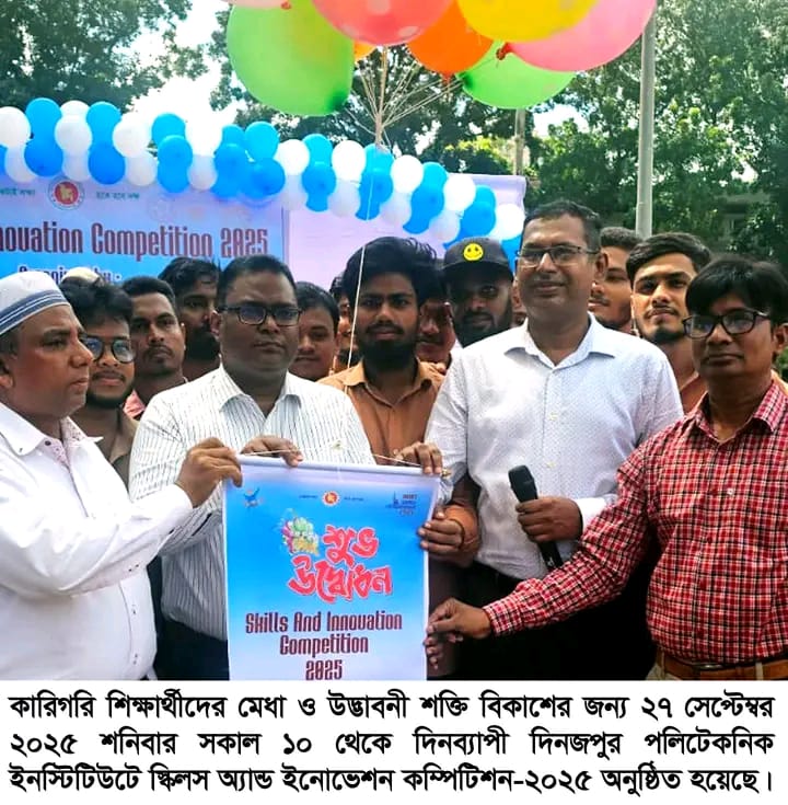 কারিগরি শিক্ষার্থীদের মেধা বিকাশ ও উদ্ভাবনী শক্তি তুলে ধরতে দিনাজপুর পলিটেকনিক ইনস্টিটিউটে শনিবার (২৭ সেপ্টেম্বর ২০২৫) দিনব্যাপী “স্কিলস অ্যান্ড ইনোভেশন কম্পিটিশন ২০২৫” অনুষ্ঠিত হয়েছে।