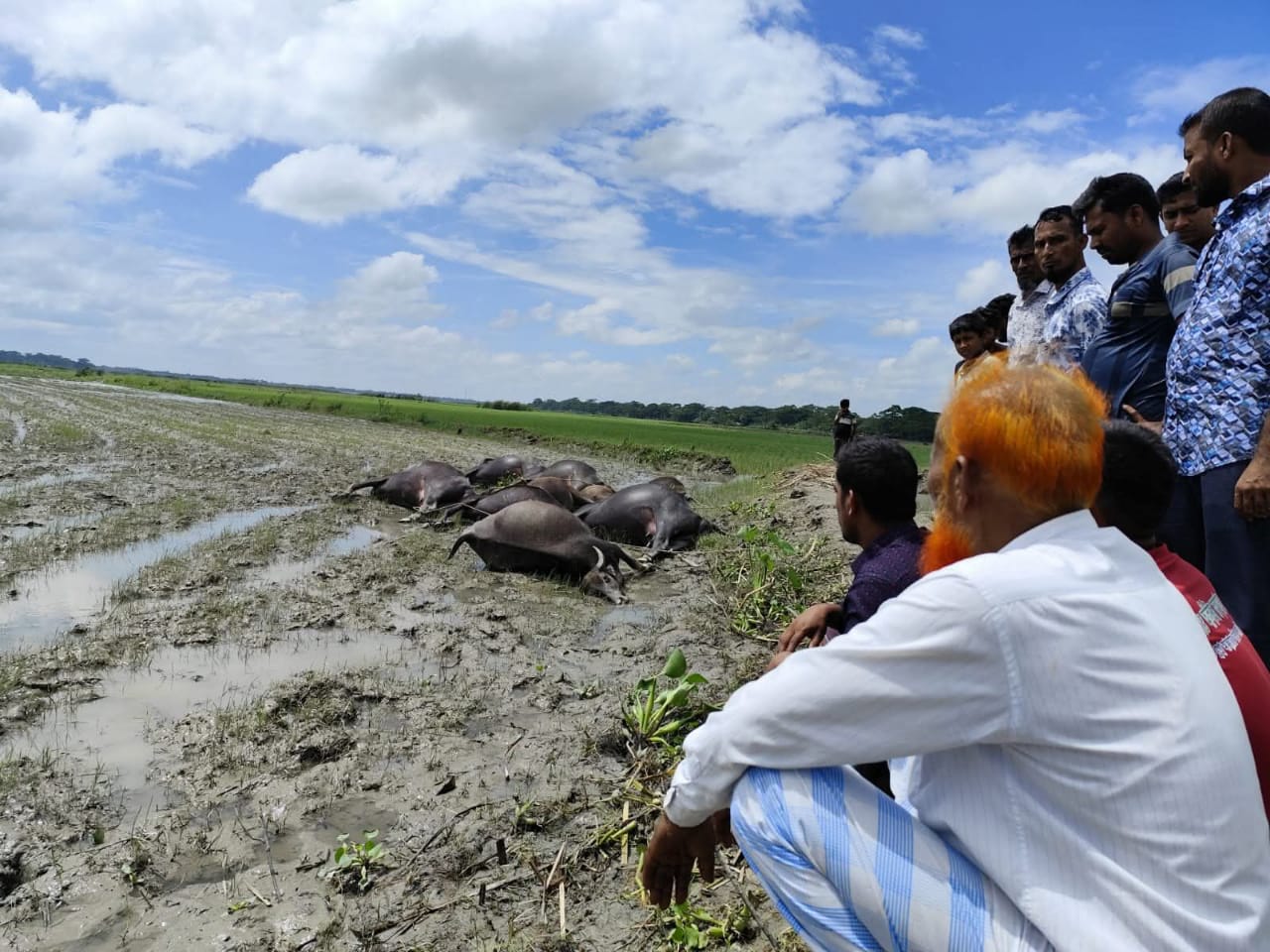 বৃহস্পতিবার (২৫ সেপ্টেম্বর) দুপুর আনুমানিক ৩টার দিকে এ ঘটনা ঘটে। মৃত মহিষগুলোর বর্তমান বাজারমূল্য প্রায় ২০ লাখ টাকা বলে ধারণা করা হচ্ছে।