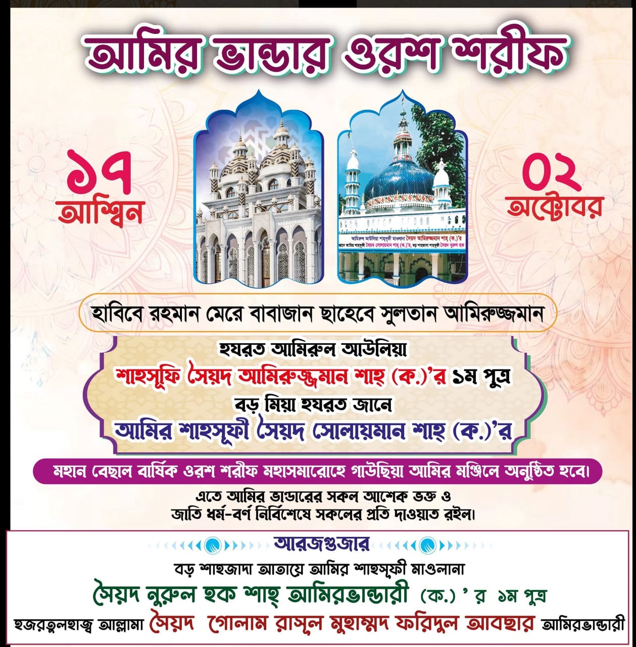 আগামী বৃহস্পতিবার ১৭ আশ্বিন (২ অক্টোবর) আমির ভান্ডার দরবার শরীফের গাউসিয়া আমির মঞ্জিল এ মাহফিলে গাউসুল আজম দস্তগীর (র) ও ওরছে শাহ সোলায়মান (ক) আশেকানে আমির ভান্ডারীর ভক্তবৃন্দদের উপস্থিতিতে মহাসমারোহে দিনব্যাপী অনুষ্ঠিত হবে।