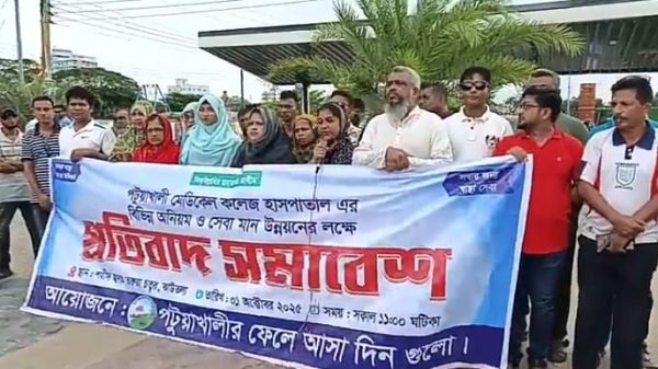 পটুয়াখালী মেডিকেল কলেজ হাসপাতালের রোগীদের চিকিৎসা সেবায় নানা অনিয়ম ও দুর্নীতির অভিযোগ এনে প্রতিবাদ সমাবেশ করেছে সাধারণ মানুষ। আজ দুপুর ১১ টায় পটুয়াখালীর ঝাউতলায় অনুষ্ঠিত এ সমাবেশে উপস্থিত হয় শত শত মানুষ।