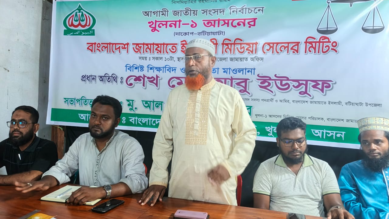 বৃহস্পতিবার সকাল ১০টার সময় জামায়াতে ইসলামী বটিয়াঘাটা শাখার নিজস্ব অফিসে অনুষ্ঠিত মিডিয়া সেলে প্রধান অতিথি হিসেবে উপস্থিত ছিলেন,জামাতে ইসলামী মনোনীত সংসদ সদস্য প্রার্থী মাওলানা শেখ আবু ইউসুফ।অনুষ্ঠানের সভাপতিত্ব করেন,মিডিয়া সেলের পরিচালক আল আমিন গোলদার,বিশেষ অতিথি হিসেবে উপস্থিত ছিলেন দৈনিক সংগ্রাম ও দৈনিক জন্মভূমির বটিয়াঘাটা উপজেলা প্রতিনিধি তরিকুল ইসলাম,অনুষ্ঠান পরিচালনা সাংবাদিক মোহাব্বাত আলী খান,অন্যান্যের মধ্যে উপস্থিত ছিলেন,মিডিয়া ব্যক্তিত্ব মোঃ খাইরুল ইসলাম নোমানী,বিপ্লব হোসেন,শাহরিয়ার হোসেন, শহিদুল ইসলাম,রিয়াজুল ইসলাম,মোঃ মিজানুর রহমান,রেজাউল ইসলাম, সহ বিভিন্ন মিডিয়া ব্যক্তিত্ব। প্রধান অতিথিত তার বক্তৃতায় বলেন,আমরা সত্যনিষ্ঠ ও বস্তুনিষ্ঠ সংবাদ প্রকাশে সব সময় সচেষ্ট থাকব। নিজেকে একজন দক্ষ সংবাদ কর্মী হিসেবে গড়ে তুলবো এটাই আমাদের লক্ষ্য।
