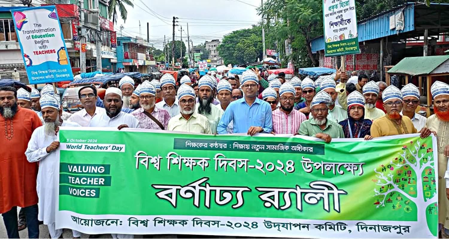 বিশ্ব শিক্ষক দিবস-২০২৪ যথাযোগ্য মর্যাদায় উদযাপিত হয়েছে দিনাজপুরে। এ উপলক্ষে শনিবার (৫ অক্টোবর) সকাল ১০টায় দিনাজপুর জিলা স্কুল প্রাঙ্গণ থেকে এক বর্ণাঢ্য র্যালি বের করা হয়। বাদ্যযন্ত্রের সুরে সাজানো র্যালিটি শহরের প্রধান প্রধান সড়ক প্রদক্ষিণ শেষে জিলা স্কুল অডিটরিয়ামে গিয়ে আলোচনা সভায় মিলিত হয়।