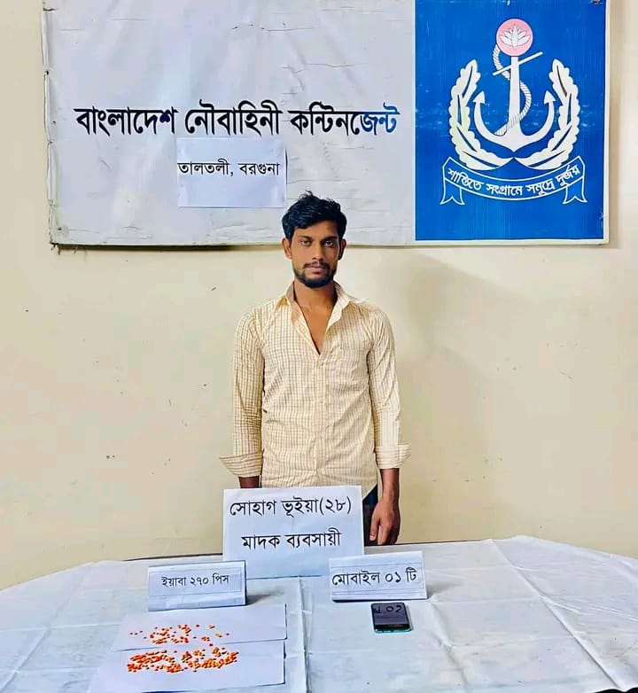 নৌবাহিনী অভিযানে বরগুনার তালতলিতে চিহ্নিত একজন মাদক ব্যবসায়ী আটক করা হয়েছে। দেশের আইন-শৃঙ্খলা পরিস্থিতি সুদৃঢ় রাখা এবং অপরাধমূলক কার্যক্রম প্রতিরোধে দায়িত্বপ্রাপ্ত একালাসমূহে নিয়মিত অভিযান পরিচলনা করছে বাংলাদেশ নৌবাহিনী। এরই ধারাবাহিকতায় গতকাল শনিবার (৪ অক্টোবার) রাতে তালতলী উপজেলাধীন কড়াইবাড়িয়া বাজার হতে নৌ গোয়েন্দা তৎপরতায় ও গোপন তথ্যের ভিত্তিতে মোঃ সোহাগ ভূইয়া (২৮) কে আটক করা হয়। পরবর্তীতে উক্ত ব্যক্তির মোটরসাইকেল ও হেলমেট তল্লাশি করে ২৭০ পিস ইয়াবা পাওয়া যায়।