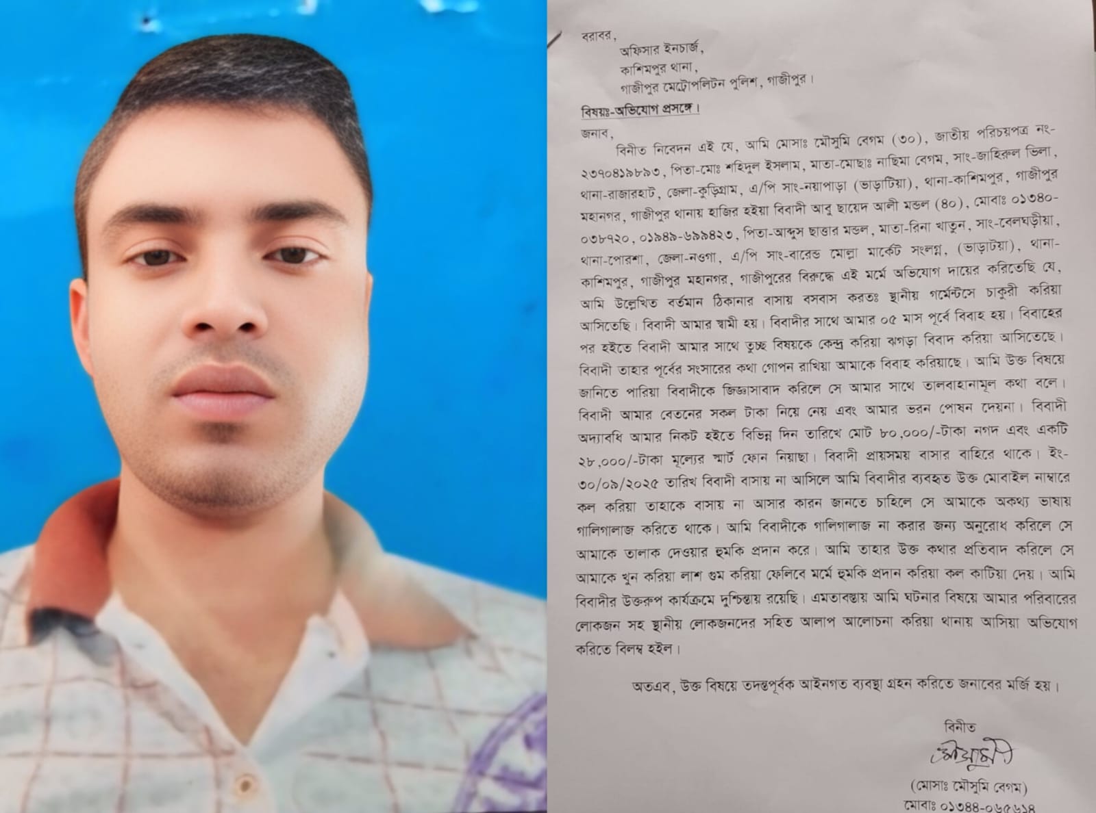 অভিযোগকারী মোসাঃ মৌসুমি বেগম (৩০), জাতীয় পরিচয়পত্র নং ২৩৭০৪১৯৮৯৩, পিতা মোঃ শহিদুল ইসলাম, মাতা মোছাঃ নাছিমা বেগম, বর্তমানে কাশিমপুর থানাধীন নয়াপাড়া এলাকায় বসবাস করেন। তিনি রাজারহাট, কুড়িগ্রামের স্থায়ী বাসিন্দা।