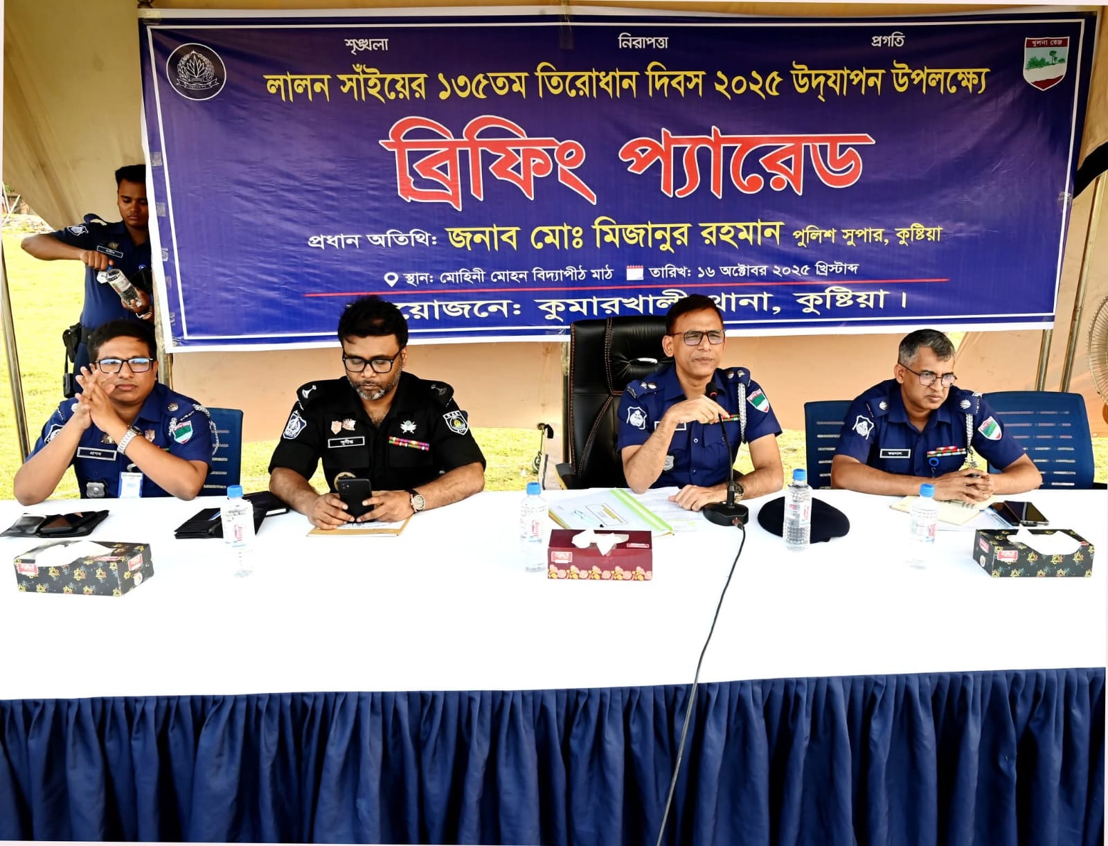 বাউল সম্রাট ফকির লালন শাহের ১৩৫ তম তিরোধান দিবস ২০২৫ উদযাপন উপলক্ষে কুষ্টিয়ায় আইন-শৃঙ্খলা ডিউটিতে নিয়োজিত অফিসার ও ফোর্সদের উদ্দেশ্যে ব্রিফিং প্যারেড অনুষ্ঠিত হয়েছে।
