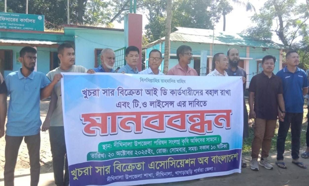 খাগড়াছড়িতে “খুচরা সার বিক্রেতাদের আইডি কার্ডধারীদের বহাল রাখুন, টি.ও(ট্রেড অর্গানাইজেশন) লাইসেন্স দিন”— এই দাবিতে মানববন্ধন করেছে খুচরা সার বিক্রেতা এসোসিয়েশন অব বাংলাদেশ, দীঘিনালা উপজেলা শাখা।