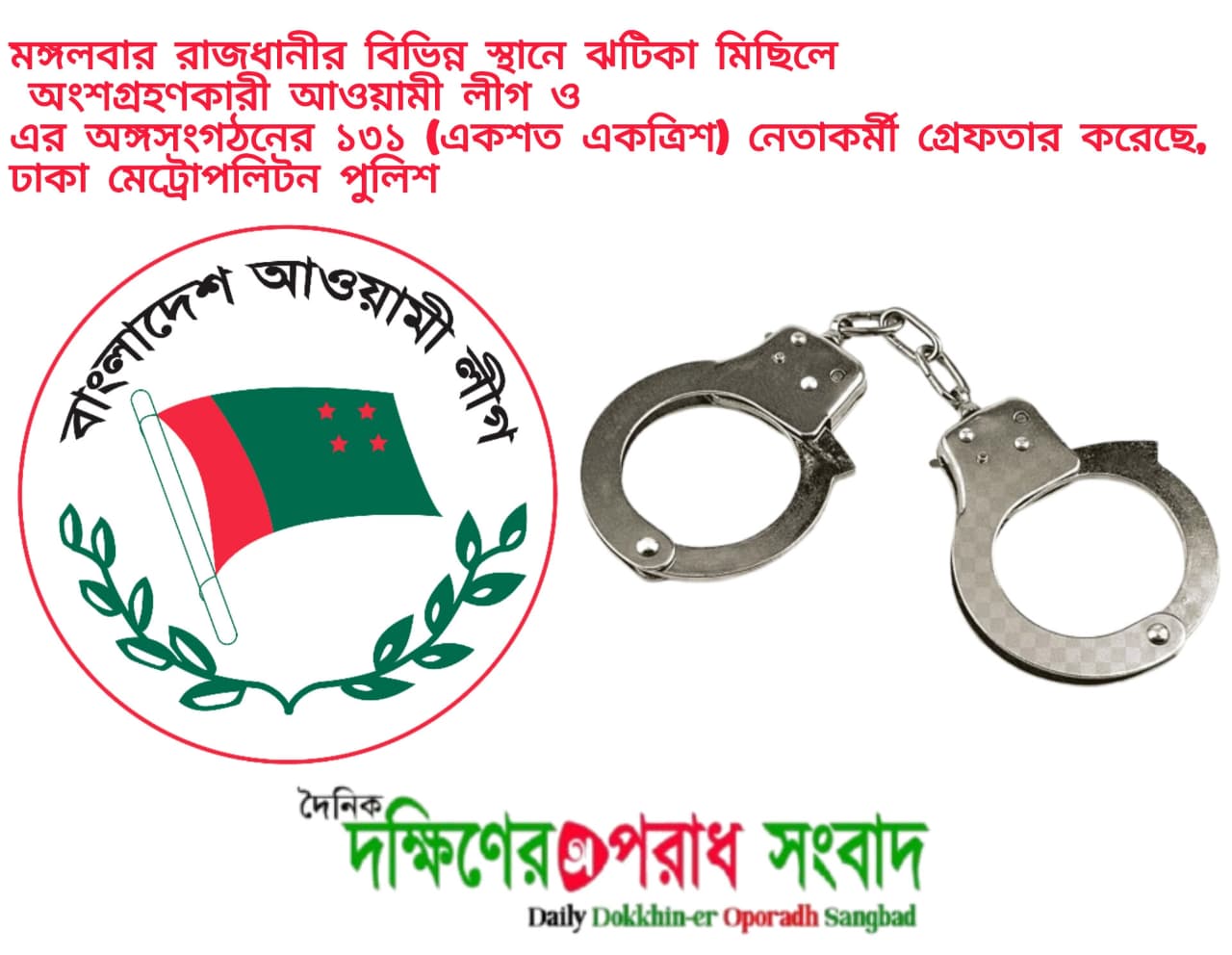 রাজধানীর বিভিন্ন স্থানে ঝটিকা মিছিলে অংশগ্রহণকারী ক আওয়ামী লীগ ও সহযোগী সংগঠনের মোট ১৩১ জন নেতাকর্মী গ্রেফতার করেছে ঢাকা মেট্রোপলিটন পুলিশ (ডিএমপি)।