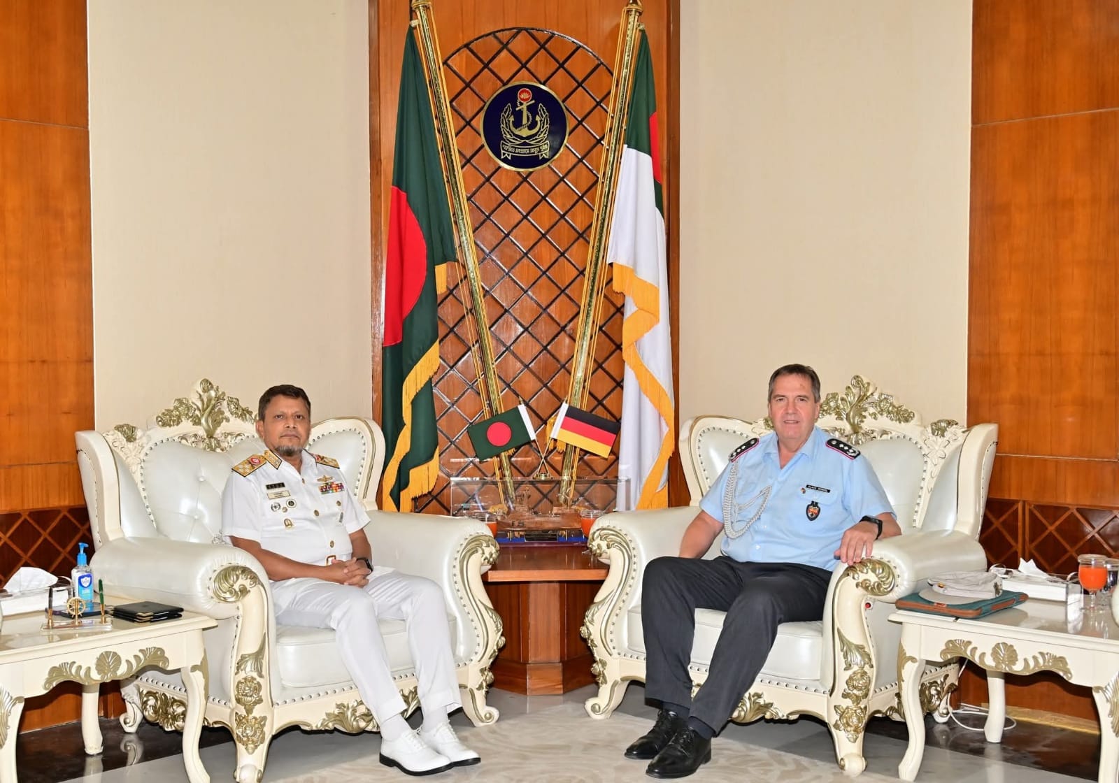 আজ বাংলাদেশ নৌবাহিনী সদর দপ্তরে নৌবাহিনী প্রধান এডমিরাল এম নাজমুল হাসানের সঙ্গে সৌজন্য সাক্ষাৎ করেন জার্মান দূতাবাসের নন-রেসিডেন্ট ডিফেন্স অ্যাটাশে কর্নেল ক্লাউস মার্কেল এবং ডেপুটি ডিফেন্স অ্যাটাশে লেফটেন্যান্ট কমান্ডার মার্কো হেলগ্রেভে।