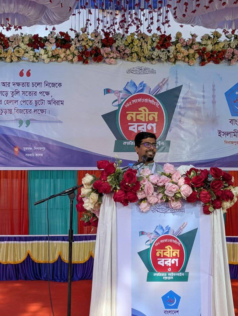 বাংলাদেশ ইসলামী ছাত্রশিবির দিনাজপুর সরকারি কলেজ শাখার উদ্যোগে ২০২৪-২৫ শিক্ষাবর্ষের নবীন শিক্ষার্থীদের বরণ এবং “নবীনবরণ ও ক্যারিয়ার গাইডলাইন প্রোগ্রাম ২০২৫” অনুষ্ঠিত হয়েছে। সোমবার (৪ নভেম্বর) অনুষ্ঠিত এ বর্ণাঢ্য আয়োজনে নবীন শিক্ষার্থীদের স্বাগত জানাতে কলেজ প্রাঙ্গণ মুখরিত হয়ে ওঠে উচ্ছ্বাসে।