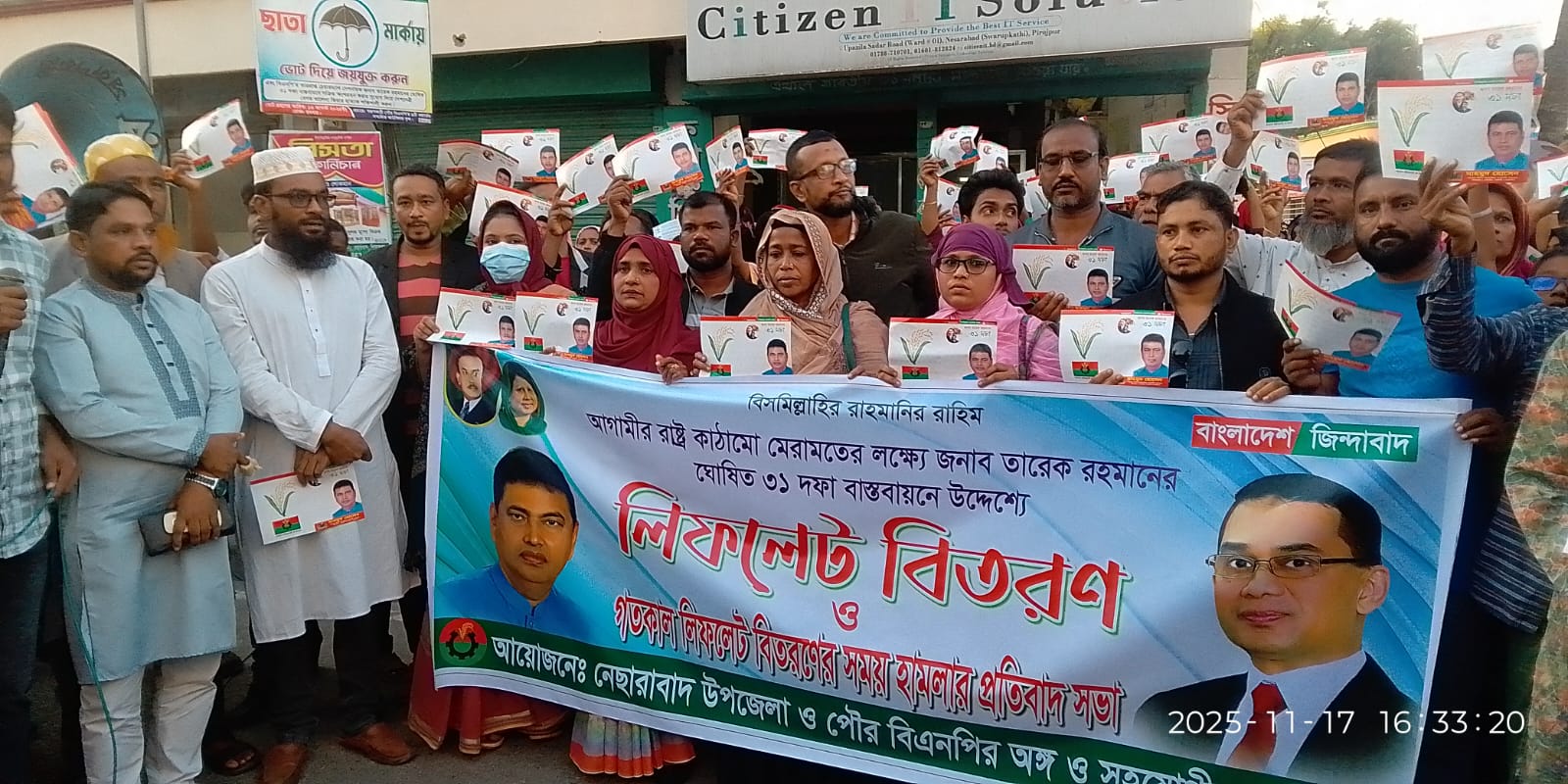 পিরোজপুর-২ আসনে বিএনপি সমর্থিত মাহমুদ হোসেন সমর্থিত নেতাকর্মীদের উদ্যোগে ৩১ দফা বাস্তবায়নের লক্ষ্যে লিফলেট বিতরণ ও গণসংযোগ কর্মসূচিতে বিএনপির প্রতিদ্বন্দ্বী সুমন মঞ্জু গ্রুপ পরিকল্পিতভাবে বাঁধা প্রদান, বিশৃঙ্খলা সৃষ্টি এবং অনুষ্ঠান পণ্ড করে দেওয়ার অভিযোগ উঠেছে। এ ঘটনার প্রতিবাদে সোমবার (১৭ নভেম্বর) বিকেলে উপজেলা চত্বরে মাহমুদ হোসেন সমর্থিত নেতাকর্মীরা জরুরি প্রতিবাদ সভার আয়োজন করেন।