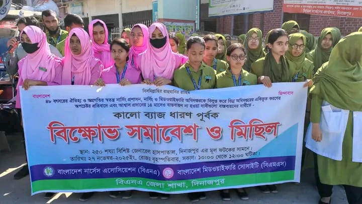 বৃহস্পতিবার সকালে দিনাজপুর মেডিকেল কলেজ হাসপাতালের সামনের সড়কে ঘন্টাব্যাপী মানববন্ধন অনুষ্ঠিত হয়। এর আগে নার্সরা বিক্ষোভ মিছিল বের করেন। একই দাবিতে ২৫০ শয্যা বিশিষ্ট জেনারেল হাসপাতালের সামনের সড়কেও মানববন্ধন কর্মসূচি পালিত হয়েছে।