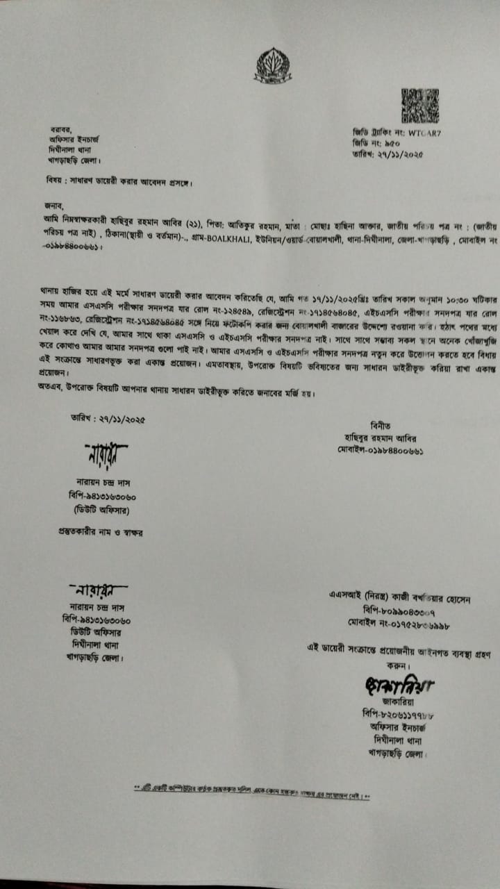 হাছিবুর রহমান আবির। আমার এসএসসি ও এইচএসসির মুল সার্টিফিকেট হারানো গিয়েছে । যাহার রোল নং ১২৪৫৪৯ রেজিস্ট্রেশন নং ১৭১৪৫৬৪০৪৫ ও এইচএসসি রোল নং ১১৬৮৬৩ রেজিস্ট্রেশন নং ১৭১৪৫৬৪০৪৫ । খাগড়াছড়ি দীঘি নালা থানা । যাহার জিডি নং ৯৫০ তারিখ ২৭/১১/২০২৫ ইং । যদি কোন সহৃদয় বান ব্যক্তি পেয়ে থাকেন। দয়া করে ০১৫৩৭১৬০৮০৫ অথবা ০১৮২০৭১৪০৬০ এই নাম্বারে যোগাযোগ করার জন্য অনুরোধ করা হল ।