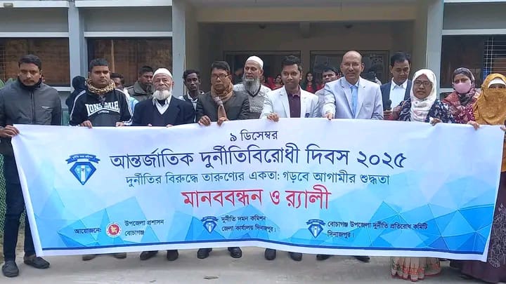 দুর্নীতির বিরুদ্ধে তারুণ্যের একতা গড়বে আগামীর শুদ্ধতা" এই প্রতিপাদ্য বিষয়কে সামনে রেখে দিনাজপুরের বোচাগঞ্জে ৯ডিসেম্বর মঙ্গলবার আন্তর্জাতিক দুর্নীতি বিরোধী দিবস ২০২৫ বিভন্ন আয়োজনের মধ্যে দিয়ে পালন করা হয়েছে। অনুষ্ঠানে সভাপতিত্ব করছেন উপজেলা দুর্নীতি প্রতিরোধ কমিটির সভাপতি ও সেতাবগঞ্জ প্রেস ক্লাবের আহবায়ক প্রবীণ সাংবাদিক আব্দুস সাত্তার। অনুষ্ঠানে প্রধান অতিথি হিসেবে উপস্থিত ছিলেন সুযোগ্য উপজেলা নির্বাহী অফিসার মোঃ মারুফ হাসান।