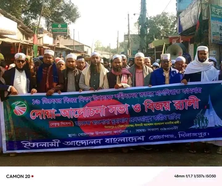 মঙ্গলবার(১৬ ডিসেম্বর) সকাল ৯টায় বোচাগঞ্জের সিনেমা হল রোডে অবস্থিত দলটির দলীয় কার্যালয়ে দোয়া ও আলোচনা সভা অনুষ্ঠিত হয়। আলোচনা শেষে একটি বিজয় র্যালি বের করা হয়, যা উপজেলার গুরুত্বপূর্ণ সড়ক প্রদক্ষিণ করে।