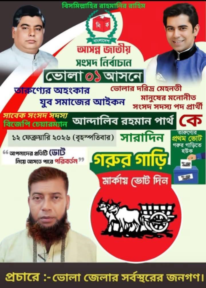 ভোলা সদর–১ আসনে জাতীয় পার্টি–বিজেপির প্রার্থী ব্যারিস্টার আন্দালিব রহমান পার্থের পক্ষে নির্বাচনী প্রচারণা দিন দিন ব্যাপকতা লাভ করছে। “সাধারণ মানুষের মার্কা—গরুর গাড়ি মার্কা”, “উন্নয়নের মার্কা—গরুর গাড়ি মার্কা”—এই স্লোগানে মুখর হয়ে উঠেছে ভোলা সদর উপজেলার প্রতিটি বাড়ি, মহল্লা, গ্রাম, ইউনিয়ন, বাজার ও বন্দর এলাকা। আবার দেখা গেছে অনেকে প্রতিকি গরুর গাড়ি মাথায় নিয়ে হাঁটছে।