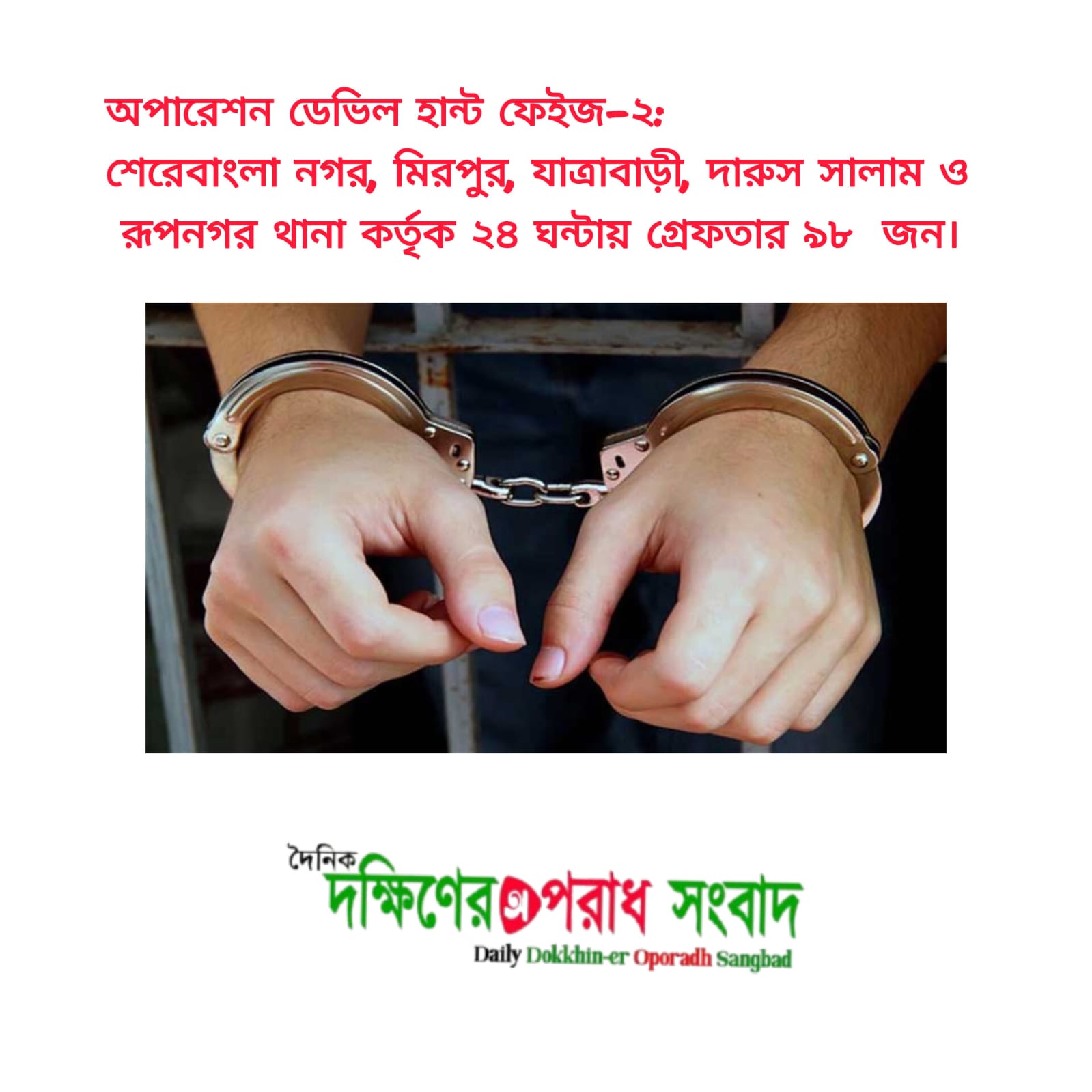 রাজধানীতে অপারেশন ডেভিল হান্ট ফেইজ-২ এর আওতায় গত ২৪ ঘন্টায় অভিযান পরিচালনা করে বিভিন্ন অপরাধে জড়িত মোট ৯৮ জনকে গ্রেফতার করেছে ঢাকা মেট্রোপলিটন পুলিশের শেরেবাংলা নগর, মিরপুর, যাত্রাবাড়ী, দারুস সালাম ও রূপনগর থানা পুলিশ। এর মধ্যে শেরেবাংলা নগর থানা ৫০ জন, মিরপুর মডেল থানা ১১ জন, যাত্রাবাড়ী থানা ১২ জন, দারুস সালাম থানা ১৪ জন ও রূপনগর থানা পুলিশ ১১ জনকে গ্রেফতার করেছে।
