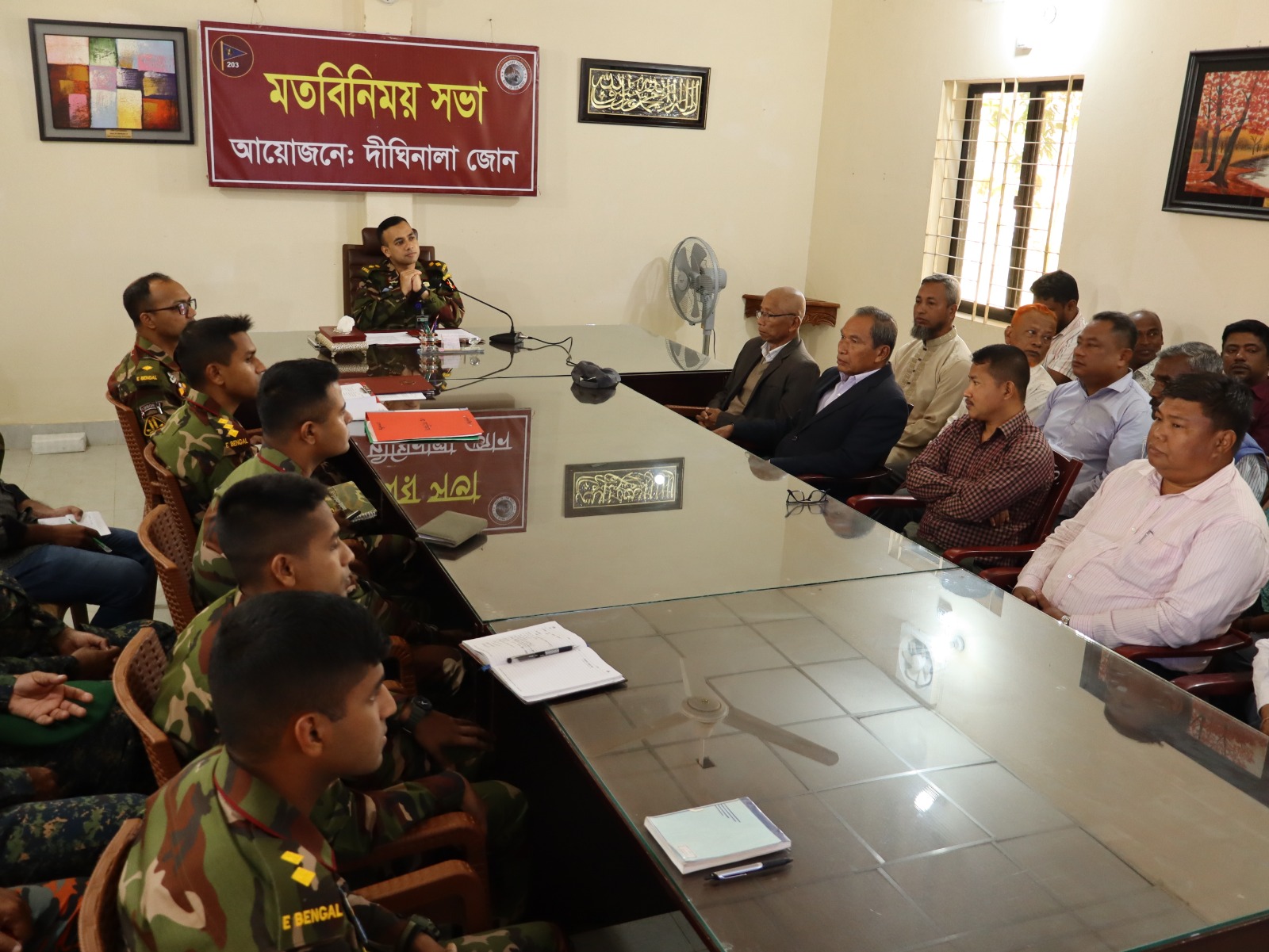 খাগড়াছড়ি দীঘিনালা, ২৩ ফেব্রুয়ারি — আজ সকাল ১১:০০ ঘটিকায় দীঘিনালা জোন-এ জোন কমান্ডার লে. কর্নেল আল-আমিন, এসইউপি, পিএসসি মহোদয়ের উপস্থিতিতে এক আলোচনা ও মতবিনিময় সভা অনুষ্ঠিত হয়েছে।