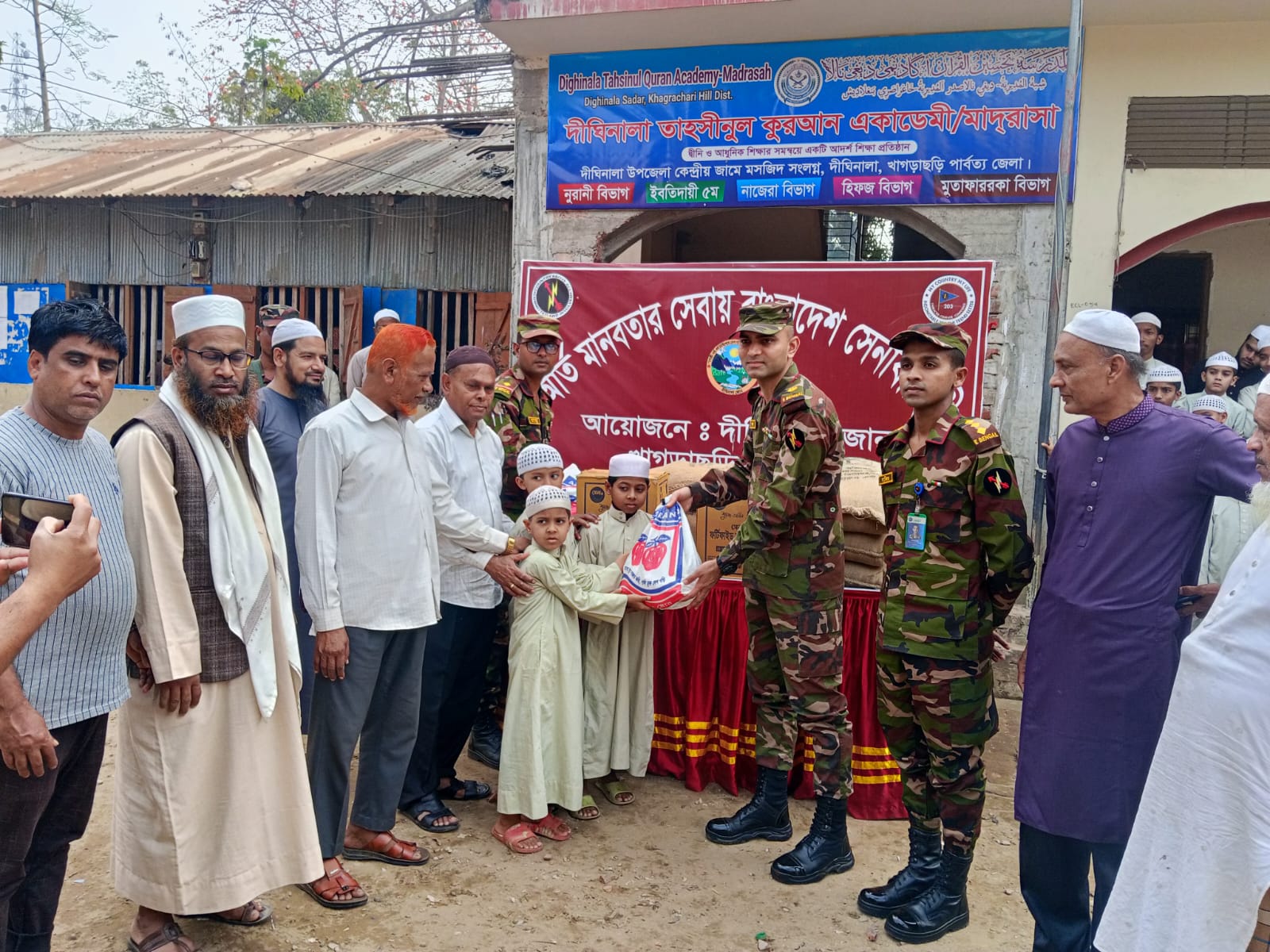 আজ আনুমানিক ১৩৫০ ঘটিকায় দীঘিনালা তাহসীনুল কুরআন একাডেমি-তে পবিত্র মাহে রমজান উপলক্ষে খাদ্যসামগ্রী বিতরণ কার্যক্রম অনুষ্ঠিত হয়। দীঘিনালা জোনের পক্ষ থেকে আয়োজিত এ কর্মসূচি জোন কমান্ডার লেফটেন্যান্ট কর্নেল মোঃ আল-আমিন (এসইউপি, পিএসসি) মহোদয়ের নির্দেশনায় এবং জোন উপ-অধিনায়ক মেজর শিহাবুন সাকিব রূশাদ (পিএসসি) স্যারের উপস্থিতিতে সম্পন্ন হয়।