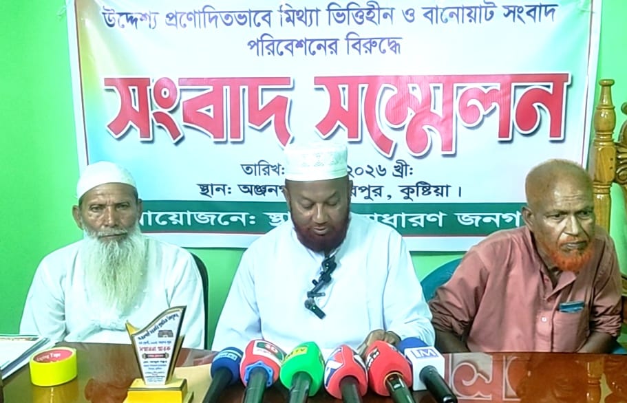 সামাজিক যোগাযোগমাধ্যমে উদ্দেশ্যপ্রণোদিতভাবে মিথ্যা, ভিত্তিহীন ও বানোয়াট তথ্য প্রচারের প্রতিবাদে কুষ্টিয়ার মিরপুর উপজেলার অঞ্জনগাছি এলাকায় সংবাদ সম্মেলন অনুষ্ঠিত হয়েছে। বৃহস্পতিবার (১২ মার্চ) বিকেলে স্থানীয় সাধারণ জনগণের উদ্যোগে অঞ্জনগাছি গ্রামে আয়োজিত এ সংবাদ সম্মেলনে এলাকাবাসী, গণ্যমান্য ব্যক্তিবর্গ ও স্থানীয় সাংবাদিকরা উপস্থিত ছিলেন।