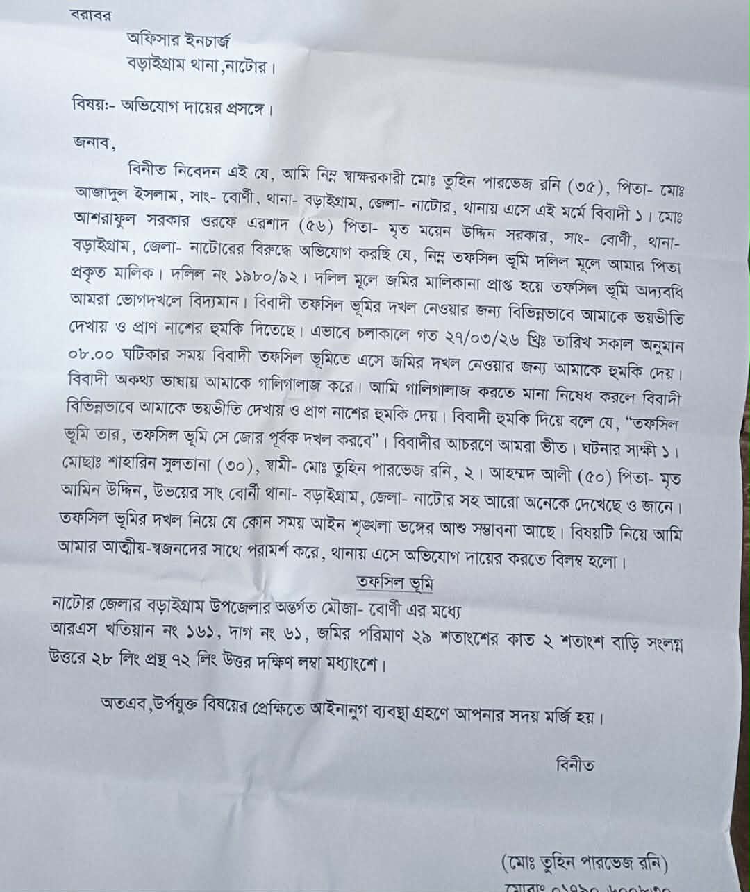 অভিযোগ সূত্রে জানা যায়, উপজেলার বোণী গ্রামের বাসিন্দা তুহিন পারভেজ রনি তার পিতা মোঃ আজাদুল ইসলামের ক্রয়কৃত দলিল (নং ১৯৮০/৯২) অনুযায়ী তফসিলভুক্ত জমির বৈধ মালিক এবং দীর্ঘদিন ধরে ভোগদখলে আছেন। অভিযোগে তিনি উল্লেখ করেন, একই গ্রামের মোঃ আশরাফুল সরকার ওরফে এরশাদ (৫৬) জোরপূর্বক জমি দখলের উদ্দেশ্যে বিভিন্ন সময় তাকে ভয়ভীতি প্রদর্শন ও প্রাণনাশের হুমকি দিয়ে আসছেন।