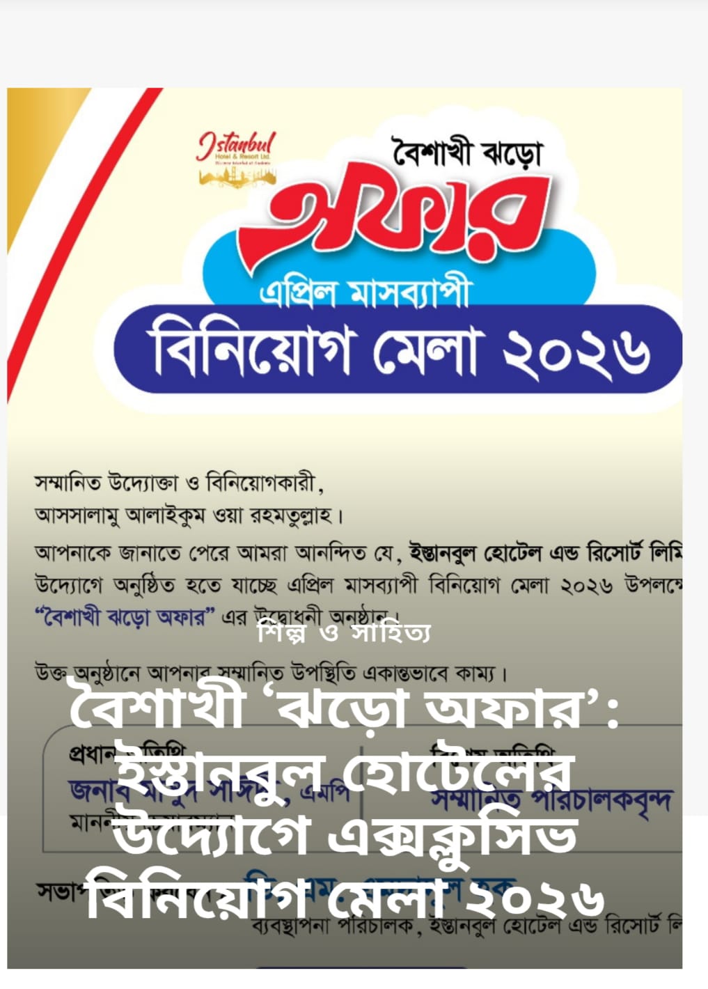 বাংলা নববর্ষের আমেজ কে ঘিরে উদ্যোক্তা ও বিনিয়োগকারীদের জন্য এক ব্যতিক্রমী আয়োজন করতে যাচ্ছে "ইস্তানবুল হোটেল এন্ড রিসোর্ট লিমিটেড।" বৈশাখী ঝড়ো অফার"শিরোনামে আগামী ০২ এপ্রিল ২০২৬ তারিখে অনুষ্ঠিত হতে যাচ্ছে এক্সক্লুসিভ মাসব্যাপী বিনিয়োগ মেলা ২০২৬ "এর উদ্বোধনী অনুষ্ঠান। এ আয়োজনকে কেন্দ্র করে ইতিমধ্যে ব্যবসায়ী ও বিনিয়োগ মহলে ব্যাপক আগ্রহে সৃষ্টি হয়েছে।