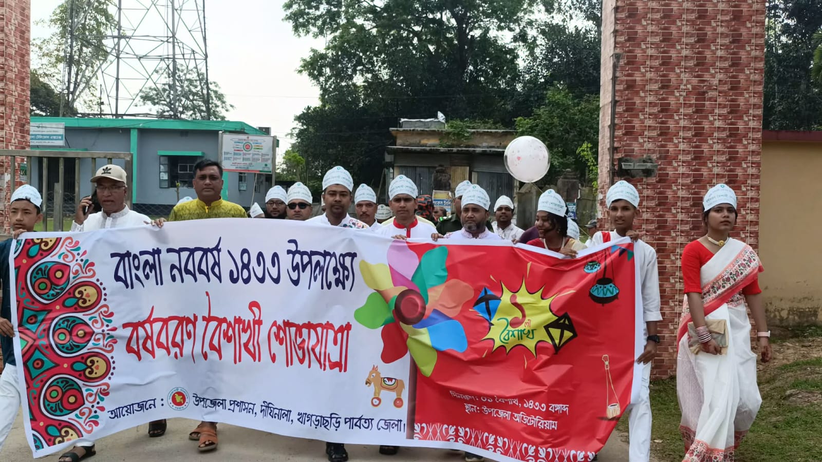 বাংলা নববর্ষের প্রথম দিন পহেলা বৈশাখ উপলক্ষে খাগড়াছড়ির দীঘিনালা উপজেলায় বর্ণিল আয়োজনের মধ্য দিয়ে উদযাপিত হয়েছে বর্ষবরণ উৎসব। সকাল থেকেই উৎসবের আমেজে মুখর হয়ে ওঠে পুরো এলাকা। নতুন বছরের শুভাগমনে আনন্দ-উচ্ছ্বাসে মেতে ওঠে সর্বস্তরের মানুষ।