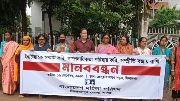 মো সালাম রাব্বানী স্টাফ রিপোর্টার,দিনাজপুর আসন্ন শারদীয় দুর্গোৎসবকে সামনে রেখে সাম্প্রদায়িক সম্প্রীতির বন্ধন আরও দৃঢ় করার আহ্বান জানিয়ে মানববন্ধন কর্মসূচি পালন করেছে বাংলাদেশ মহিলা পরিষদ দিনাজপুর জেলা শাখা। মঙ্গলবার (১৬